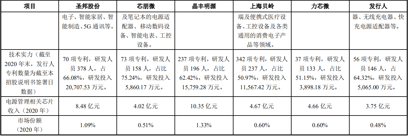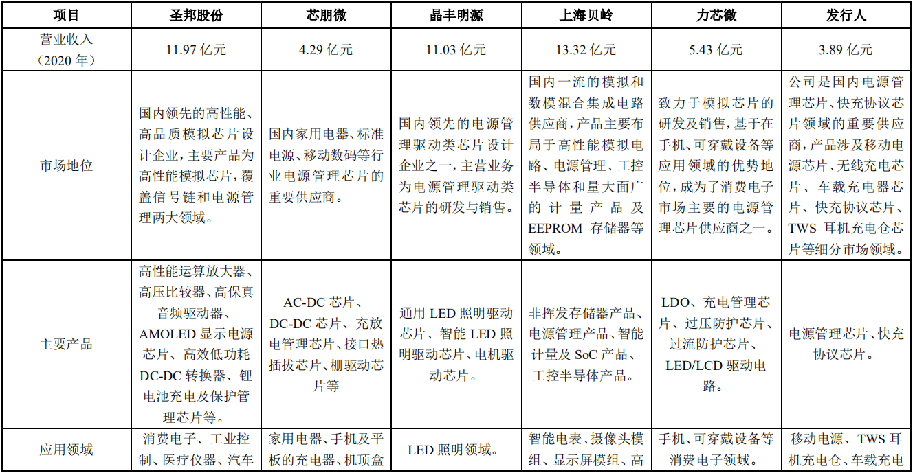 英集芯選取經(jīng)營規(guī)模相差較小、從事電源管理芯片設(shè)計(jì)業(yè)務(wù)的芯片設(shè)計(jì)公司作為對比,具體包括圣那股份、晶豐明源、芯朋微、力芯微和上海貝嶺。這些同行業(yè)公司均有電源管理芯片的研發(fā)和銷售業(yè)務(wù),在各自細(xì)分領(lǐng)域有一定的競爭優(yōu)勢,對比情況如上圖所示。