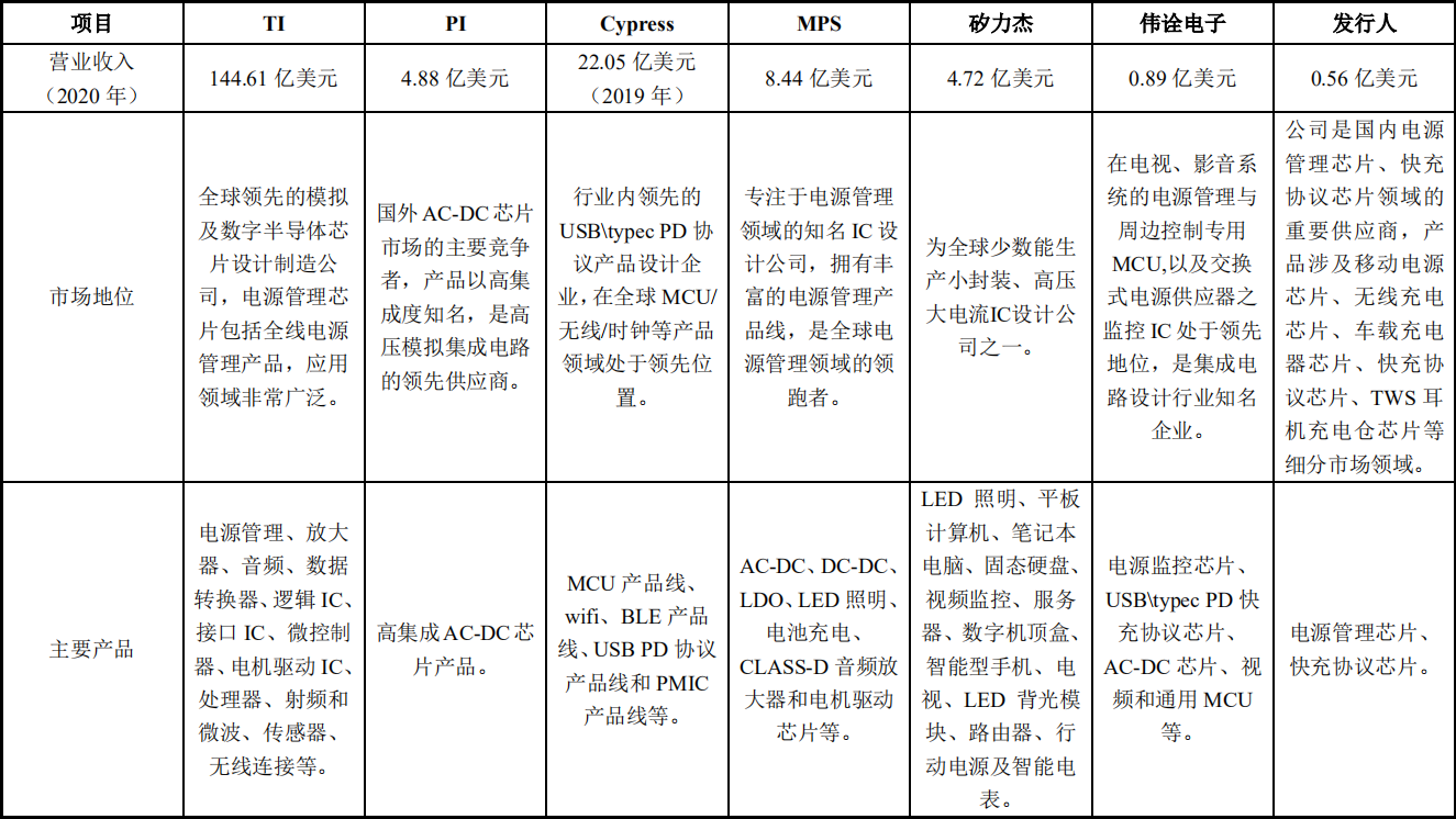 目前A股上市公司中與英集芯類似的基于數(shù)模混合SoC集成技術(shù)并以電源管理芯片、快充協(xié)議芯片產(chǎn)品為最主要業(yè)務(wù)收入來源的電源管理芯片設(shè)計(jì)公司數(shù)量很少。