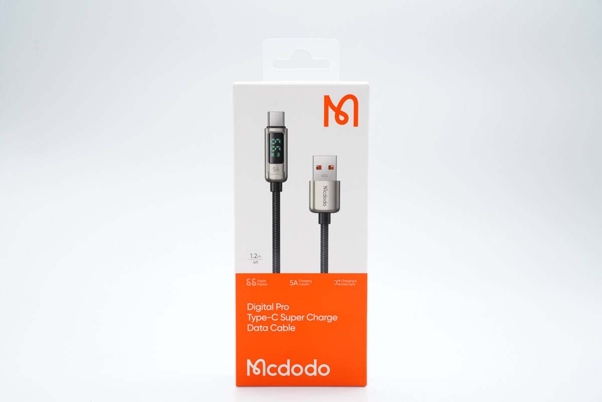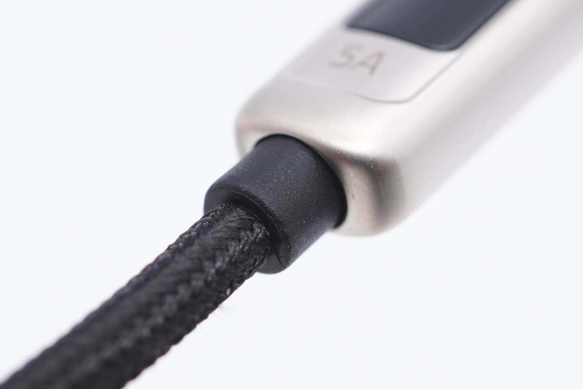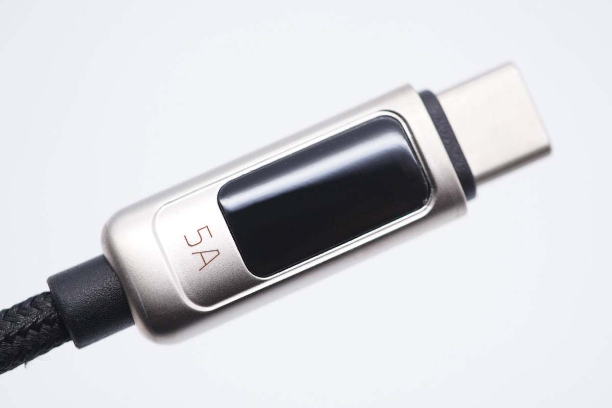 USB-C線(xiàn)頭也是一體成型鋅合金外殼,并配有高清數(shù)顯屏,旁邊有5A字樣,表明線(xiàn)纜支持5A大電流傳輸。