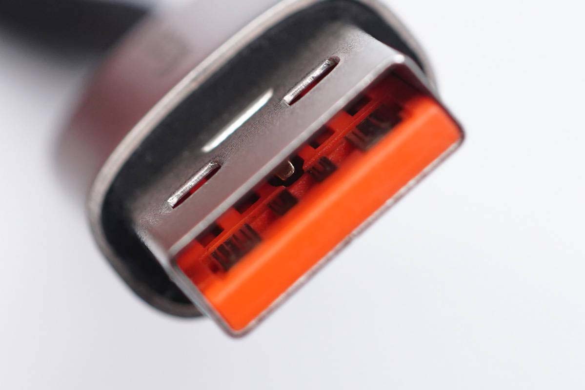 USB-A公頭正負(fù)極加寬來(lái)通過(guò)大電流,中心有特殊觸點(diǎn)。