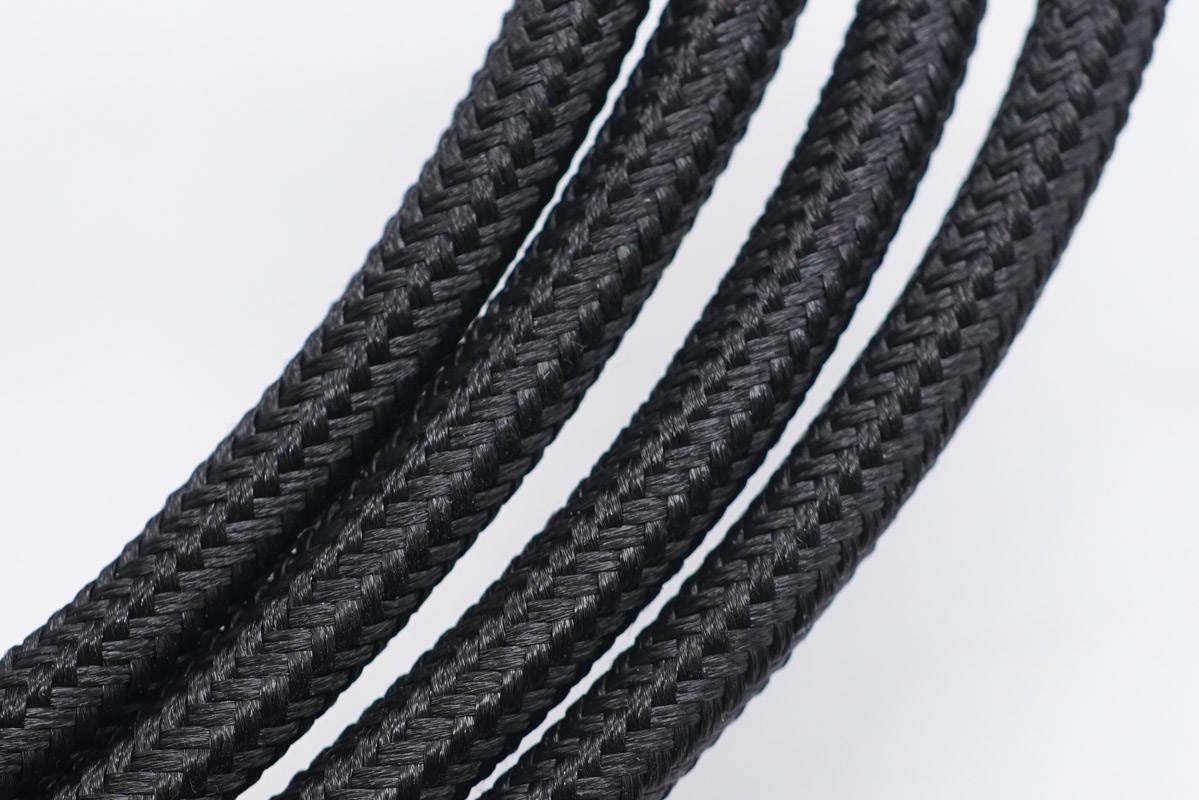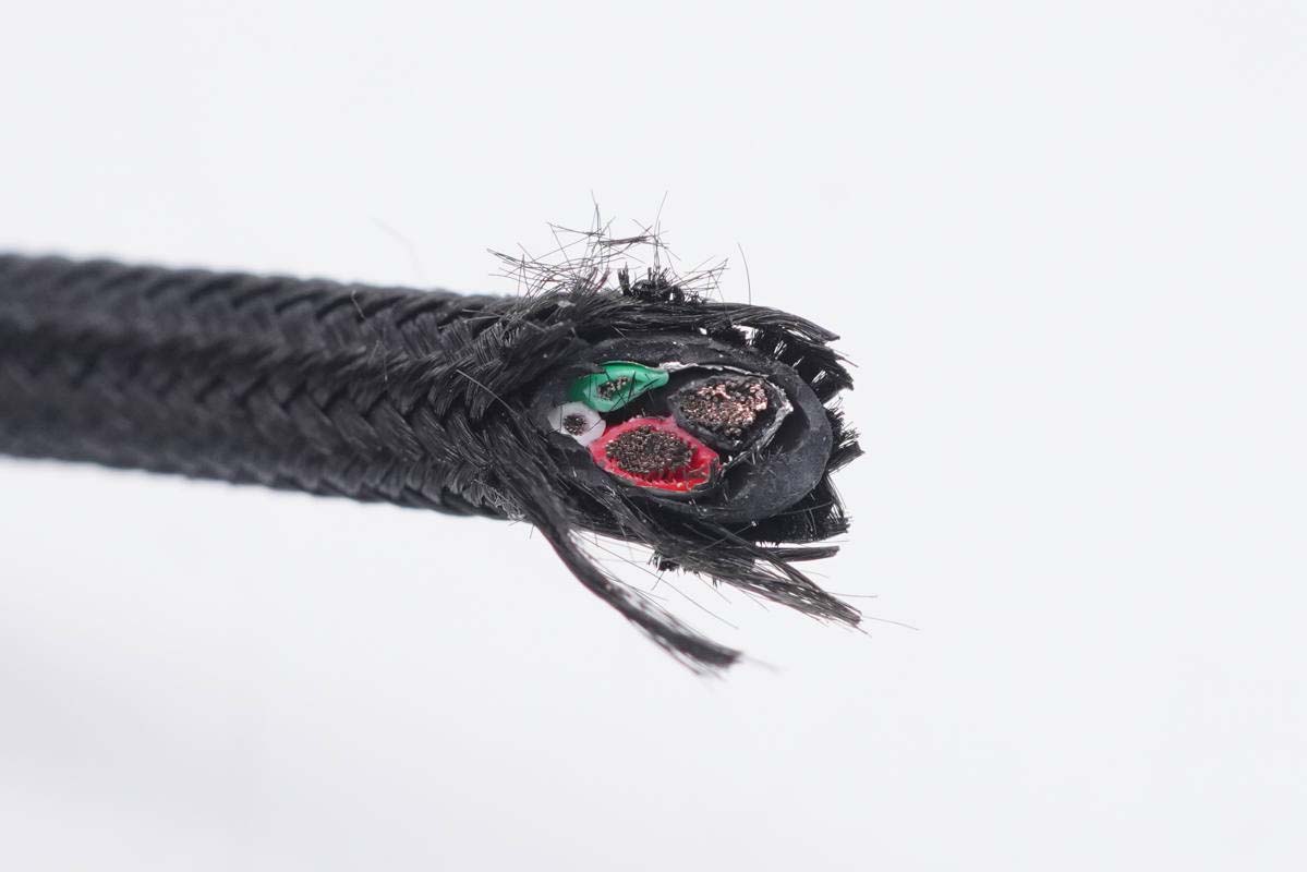黑色線(xiàn)芯特寫(xiě),內(nèi)部摻有抗拉線(xiàn),另外三根線(xiàn)芯也是相同設(shè)計(jì),提升線(xiàn)纜整體抗拉性能。