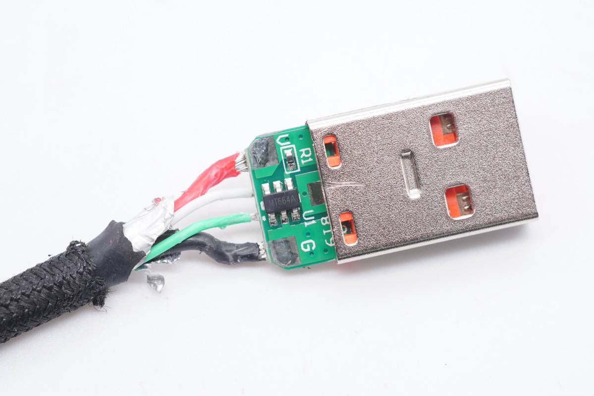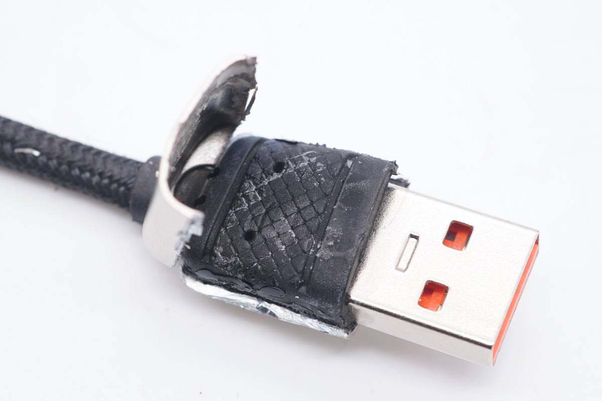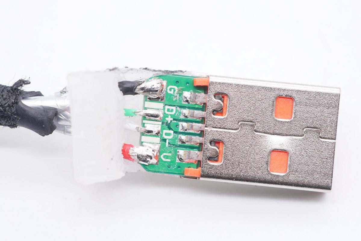 將USB-A線(xiàn)頭金屬殼切割開(kāi),內(nèi)部填充硬封膠。