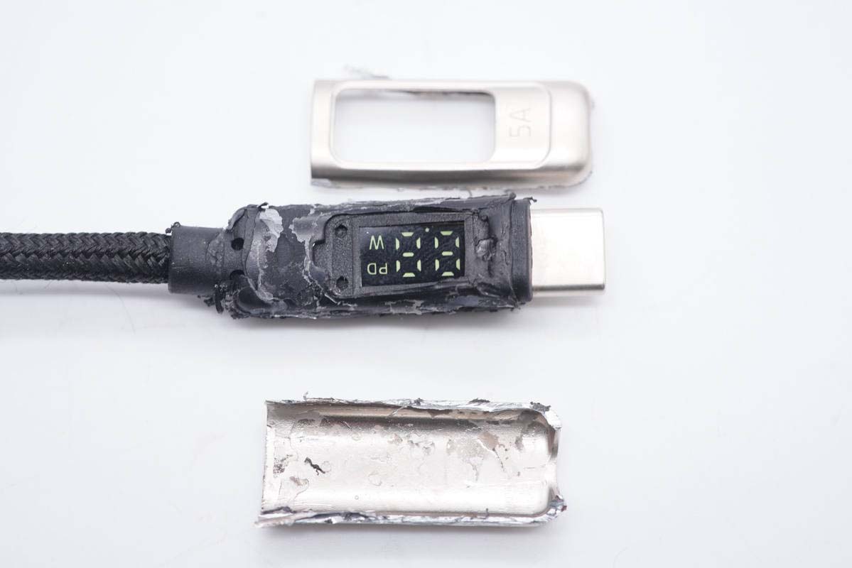 USB-C線(xiàn)頭鋅合金外殼拆開(kāi),內(nèi)部也是填充硬封膠。