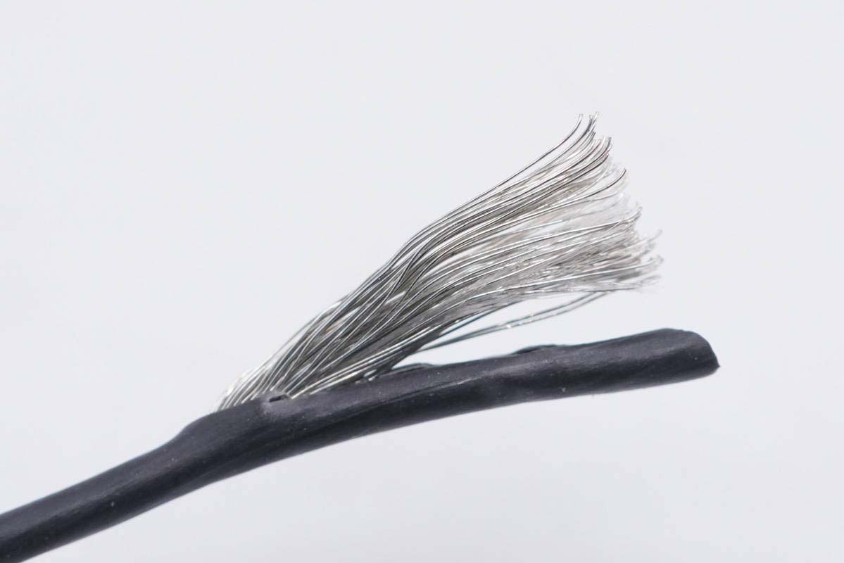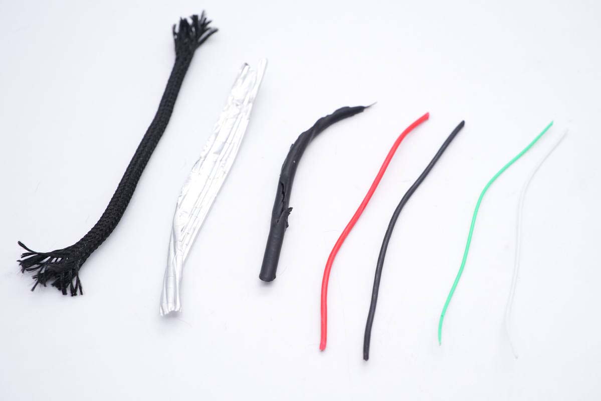 線(xiàn)纜全部拆開(kāi)一覽,從左到右依次是編織外衣、屏蔽錫紙、TPE外皮、紅黑電力線(xiàn)芯、白綠數(shù)據(jù)線(xiàn)芯。