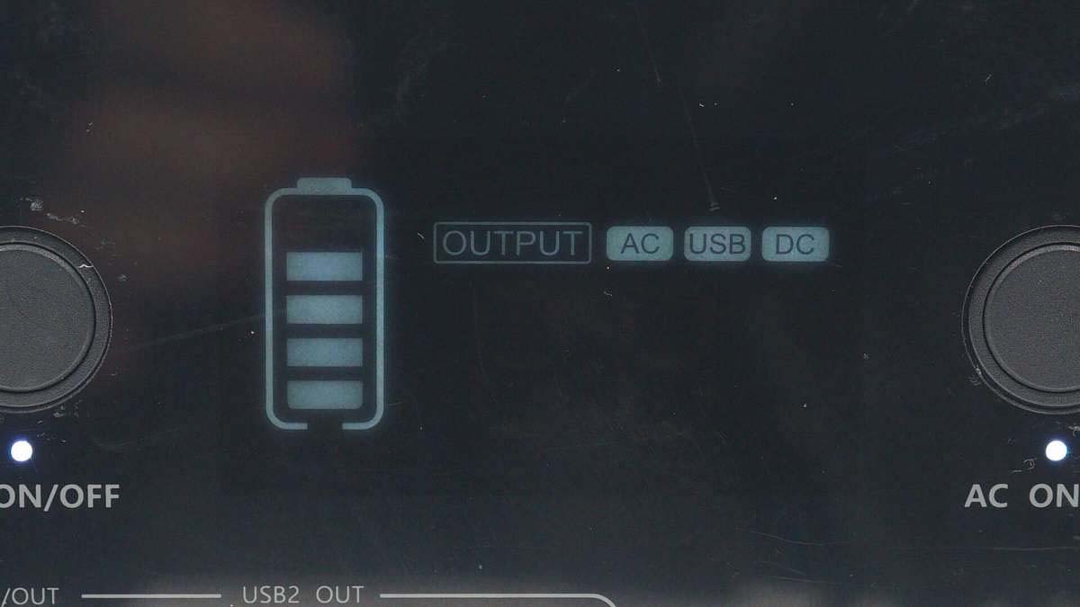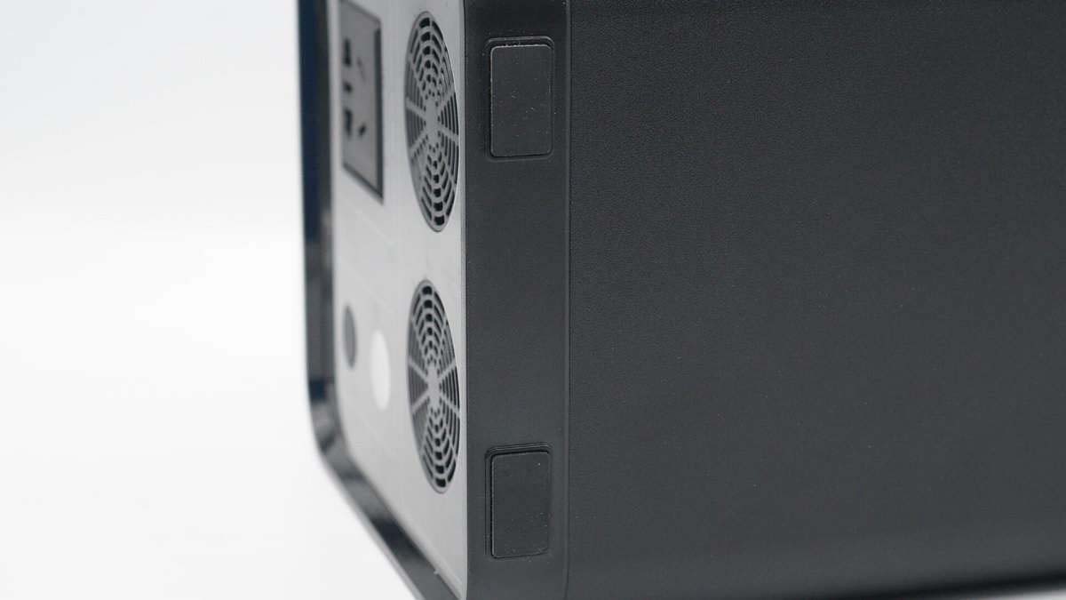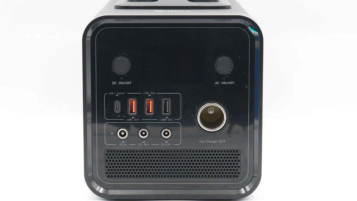 機身兩端是亞克力材質(zhì)面板裝飾,這一端配有3A1C三個USB接口、一個點煙器接口以及一輸入兩輸出共三個DC接口,上端設(shè)有獨立的DC和AC開關(guān),下方設(shè)有散熱孔。