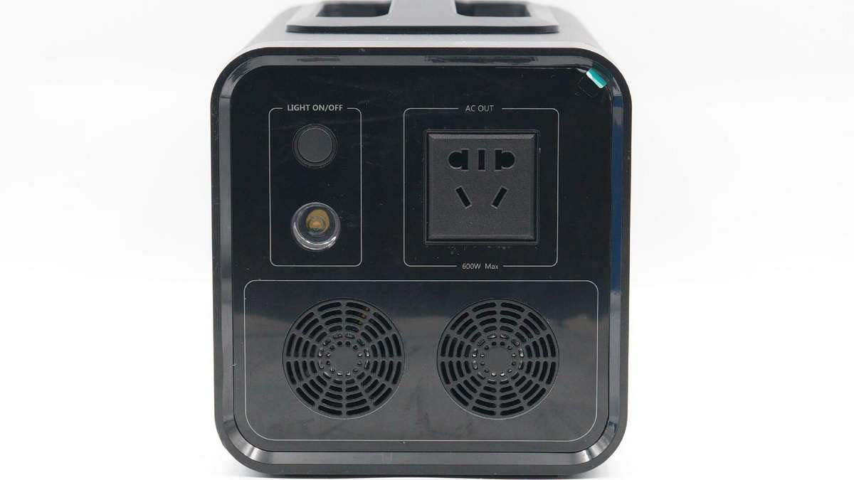 另一端上方左側(cè)是照明燈以及對應(yīng)開關(guān)鍵,右側(cè)是3+2國標(biāo)組合AC插口,內(nèi)置安全門防異物。下方是兩個風(fēng)扇窗口。