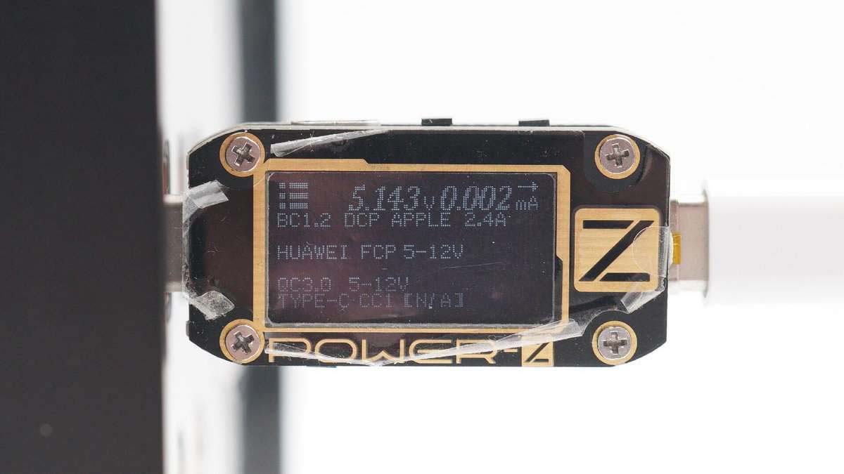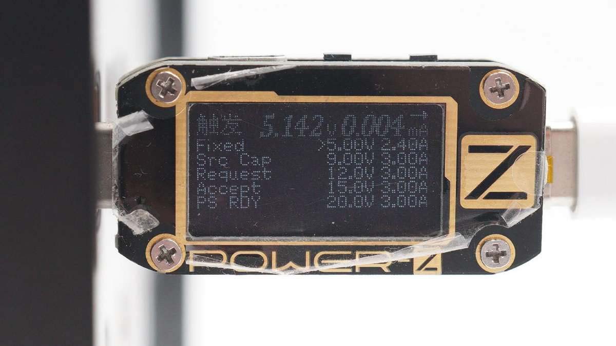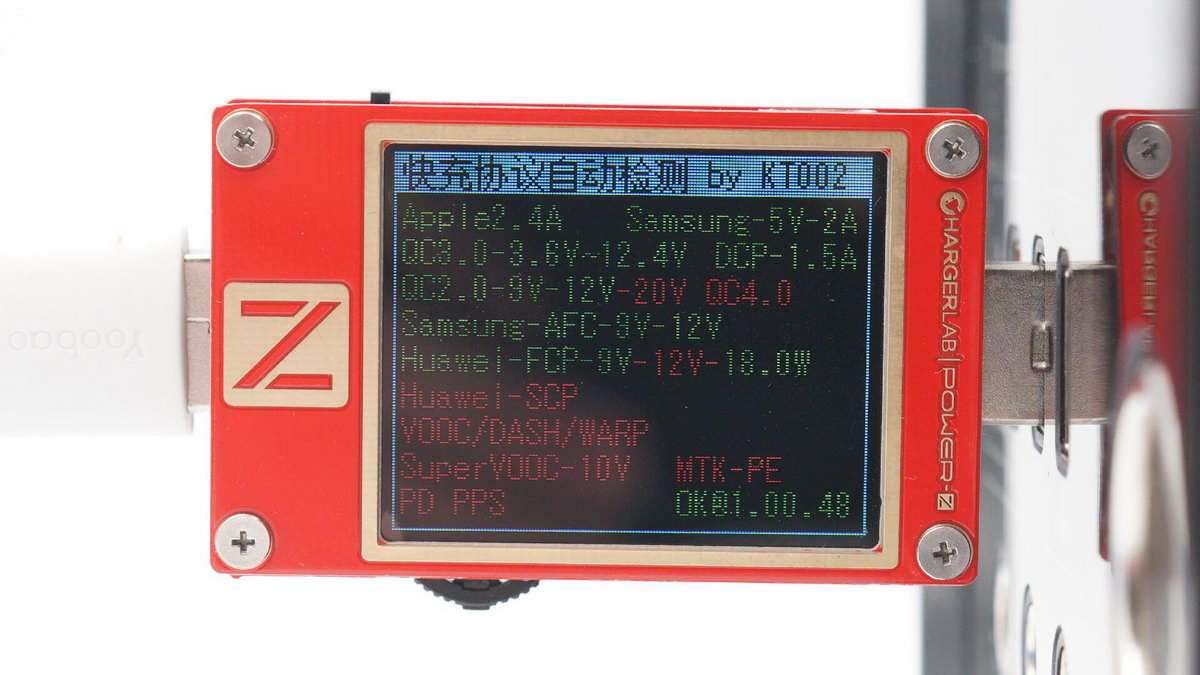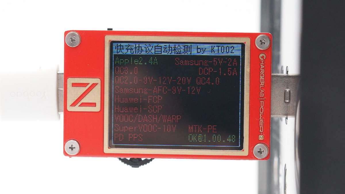 使用ChargerLAB POWER-Z KM001C測得USB-C口支持Apple 2.4A、DCP、FCP、QC3.0、PD等協(xié)議。