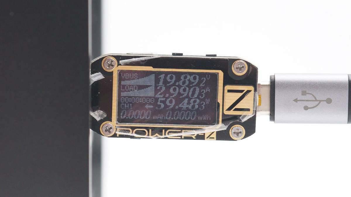 實測通過C口給公牛600W戶外移動電源充電,充電功率為(19.89V 、2.99A )59.48W。