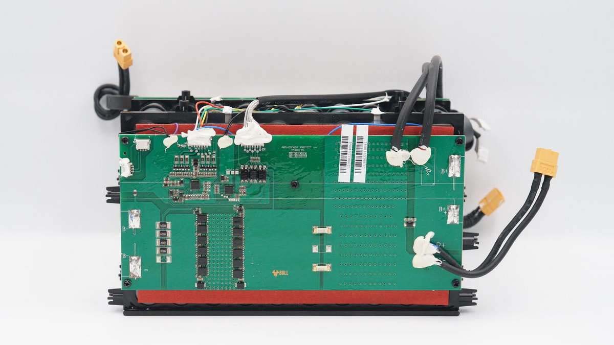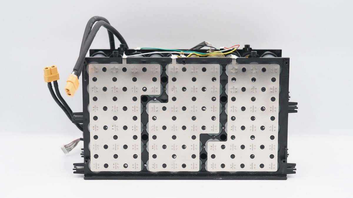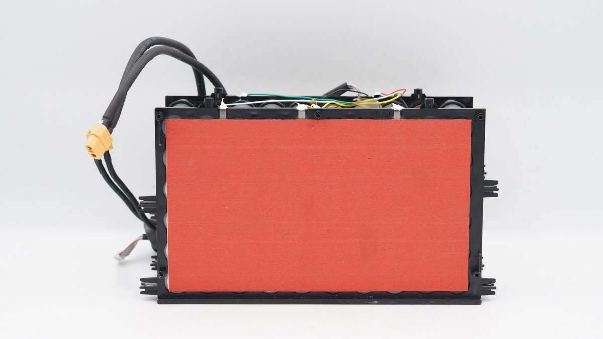 電池組上下均有塑料支架固定保護,一共6排電池,每排10顆,整個電池組總共有60顆電池,6串連接。按照165000mAh計算,單節(jié)電池容量為2750mAh。另外上端有逆變器電路板,底部有電池保護電路板。
