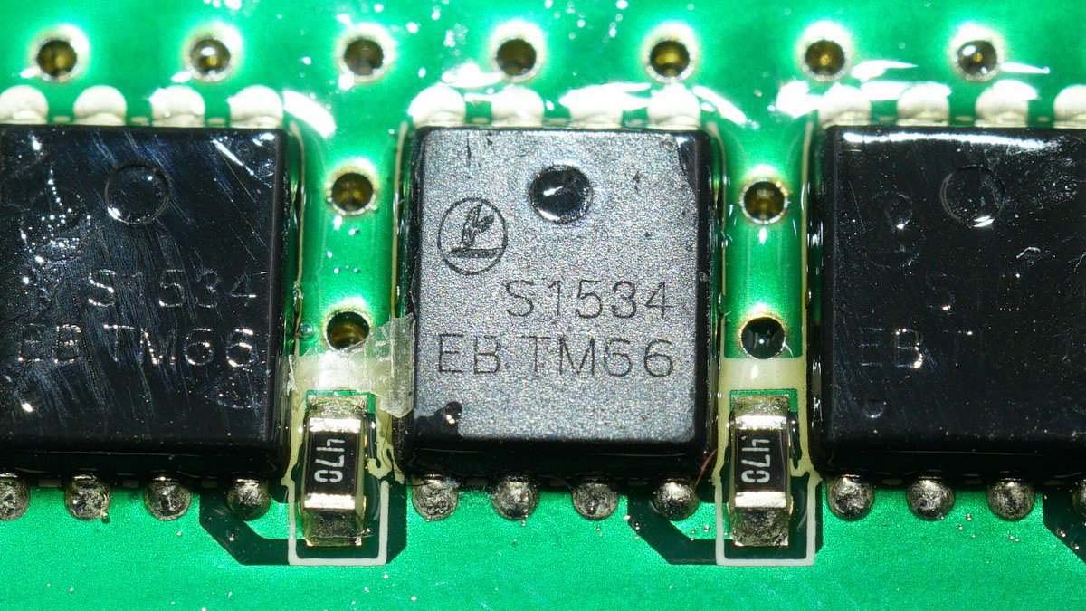 兩排共12顆絲印S1534的MOS管,用于電池保護。