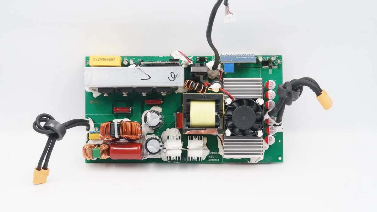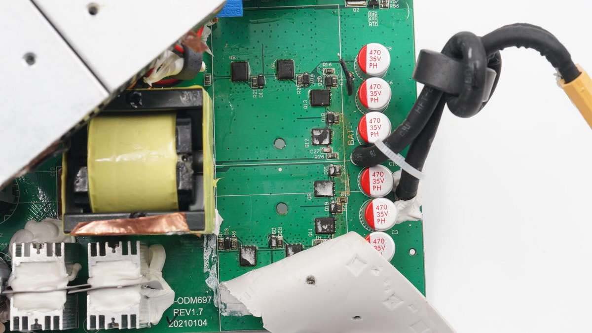 充電頭網(wǎng)通過拆解了解到,公牛這款儲能電源內(nèi)置6串電池,共有60顆之多,采用中穎SH367305進行保護,配置東軟載波HR8P506FHNK MCU;逆變器采用了屹晶微逆變升壓方案,主控芯片為屹晶微EG1611,另外采用EG2132驅(qū)動泰德MOS管升壓,臺半HER1008G用于逆變升壓輸出整流,EG8025調(diào)制輸出波形。