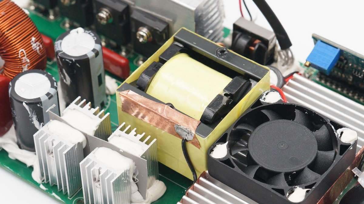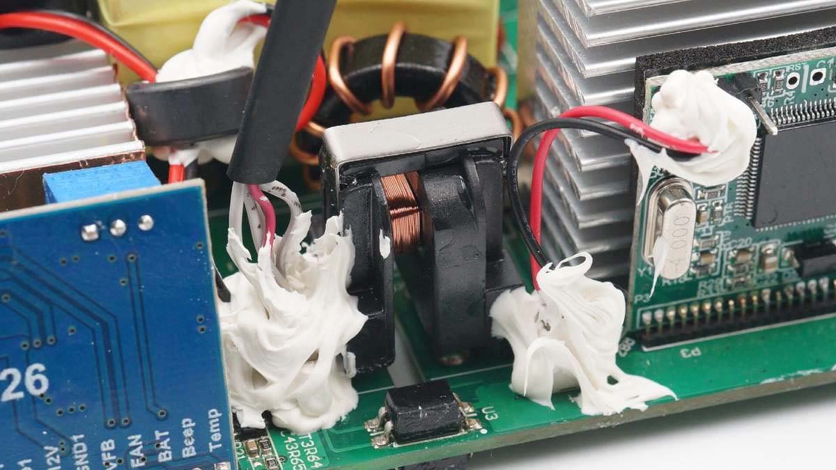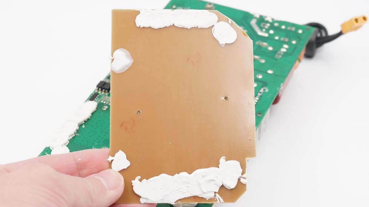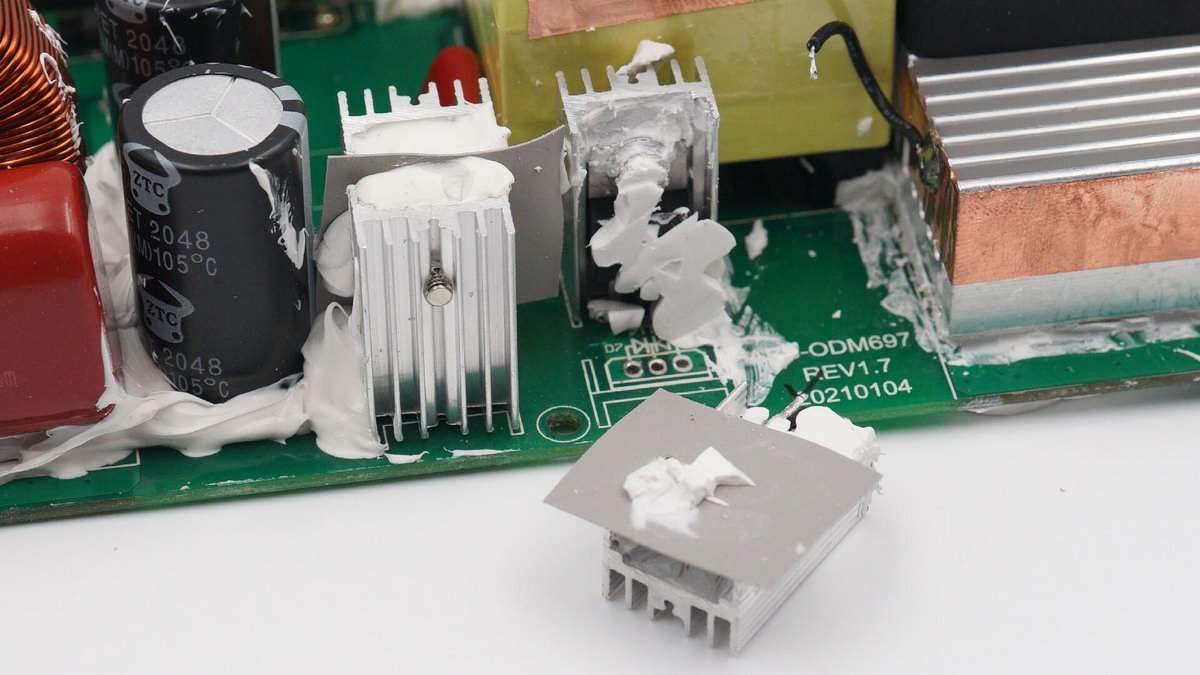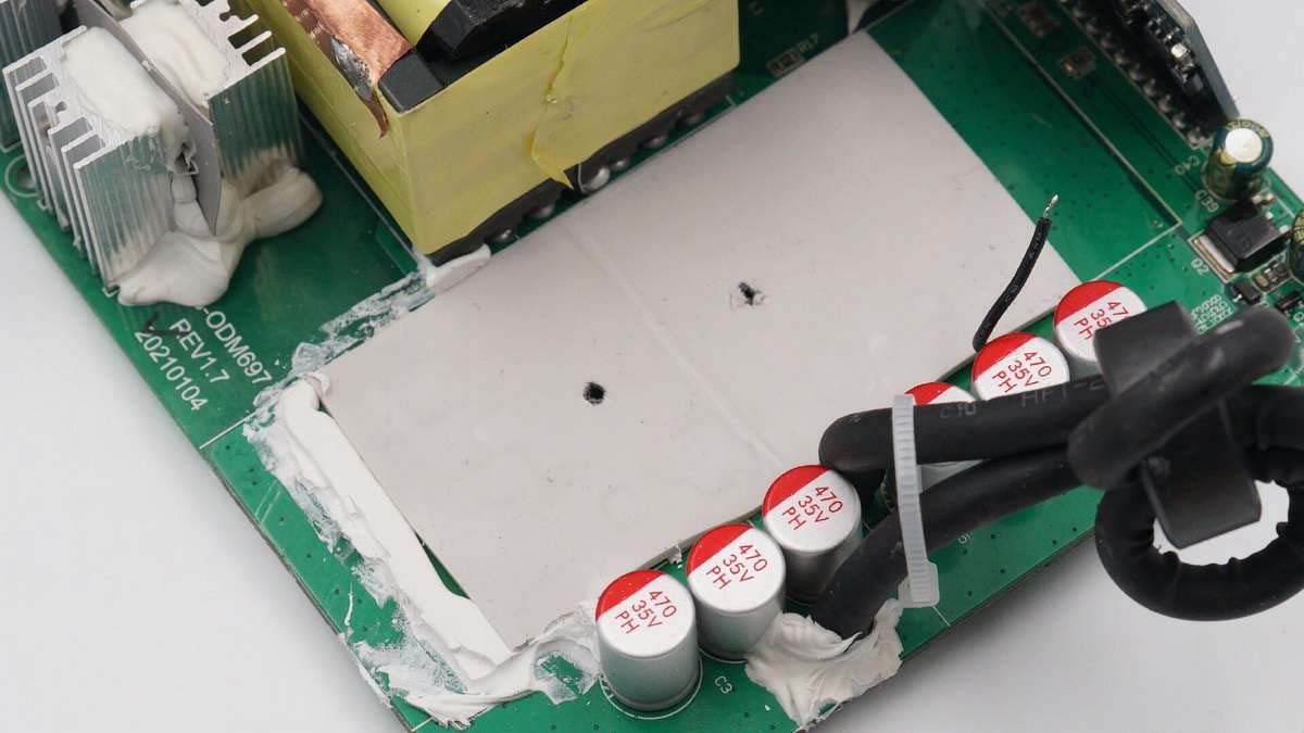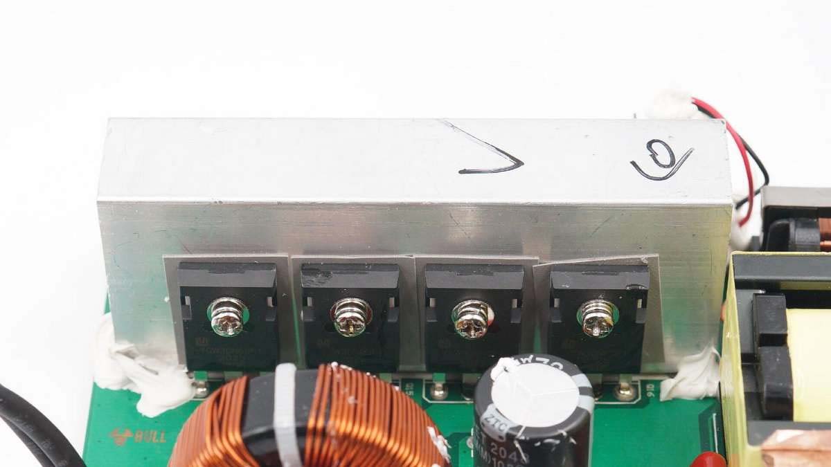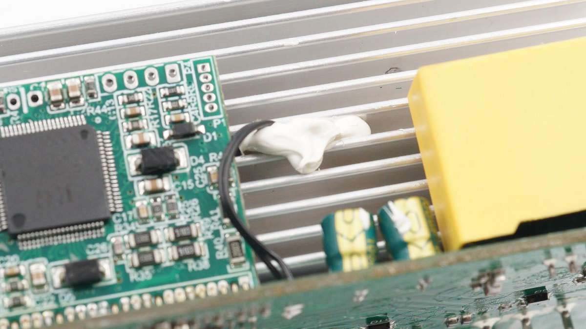 散熱片和逆變升壓變壓器的銅箔使用一根導(dǎo)線接地。旁邊矗立四個小型散熱片,之間夾有導(dǎo)熱墊。