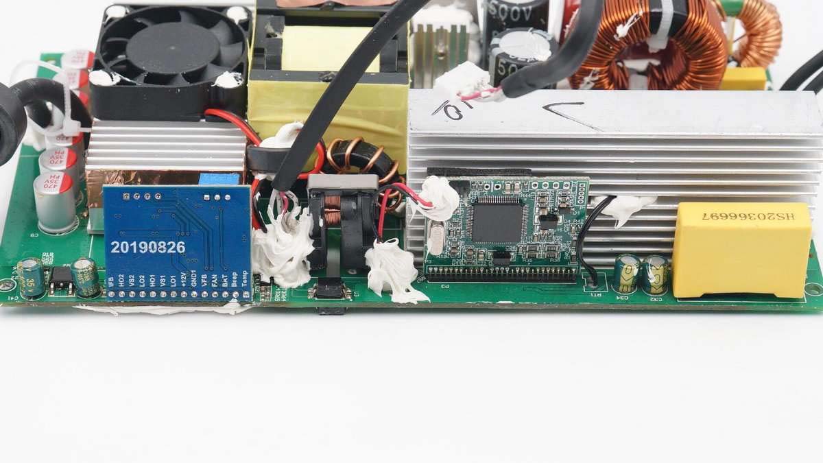 逆變器電路板正面一覽,輸入端有一排濾波固態(tài)電容,旁邊的散熱片上固定有小風(fēng)扇,加強散熱效果,輸出端的共模電感電等器件打膠加固。
