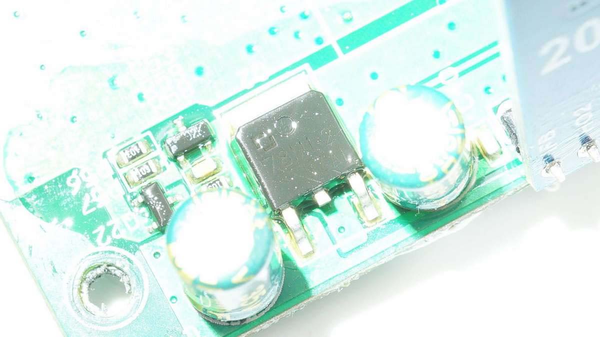 外掛四顆MOS管輸出升降壓,反光可見整板涂有防潮膠。