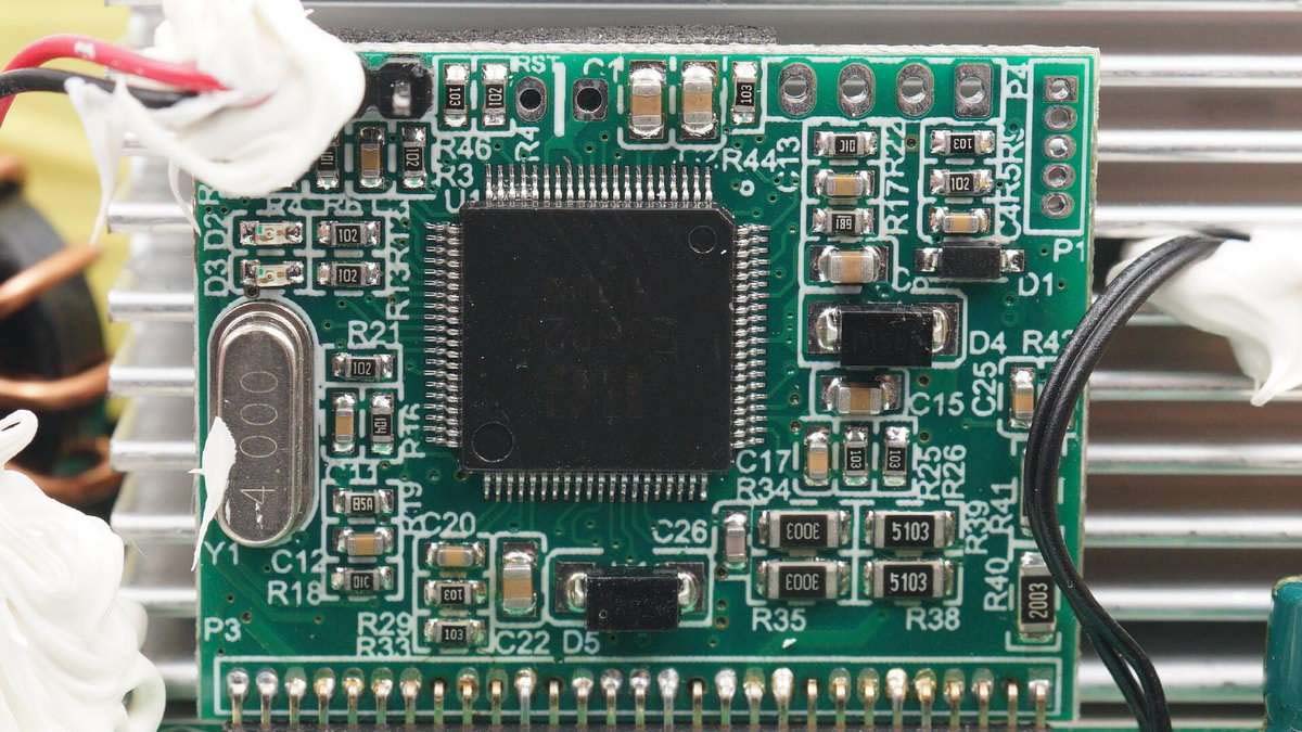 散熱片側(cè)身包裹屏蔽銅箔,頂部有風(fēng)扇吹風(fēng)帶走熱量。