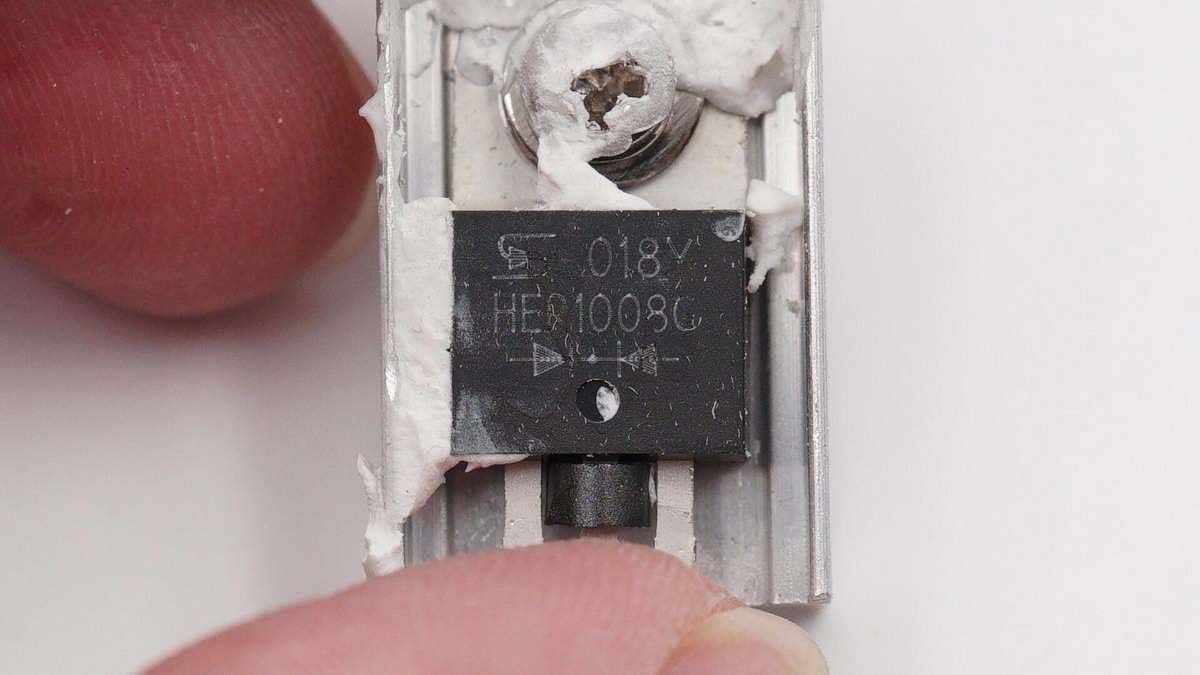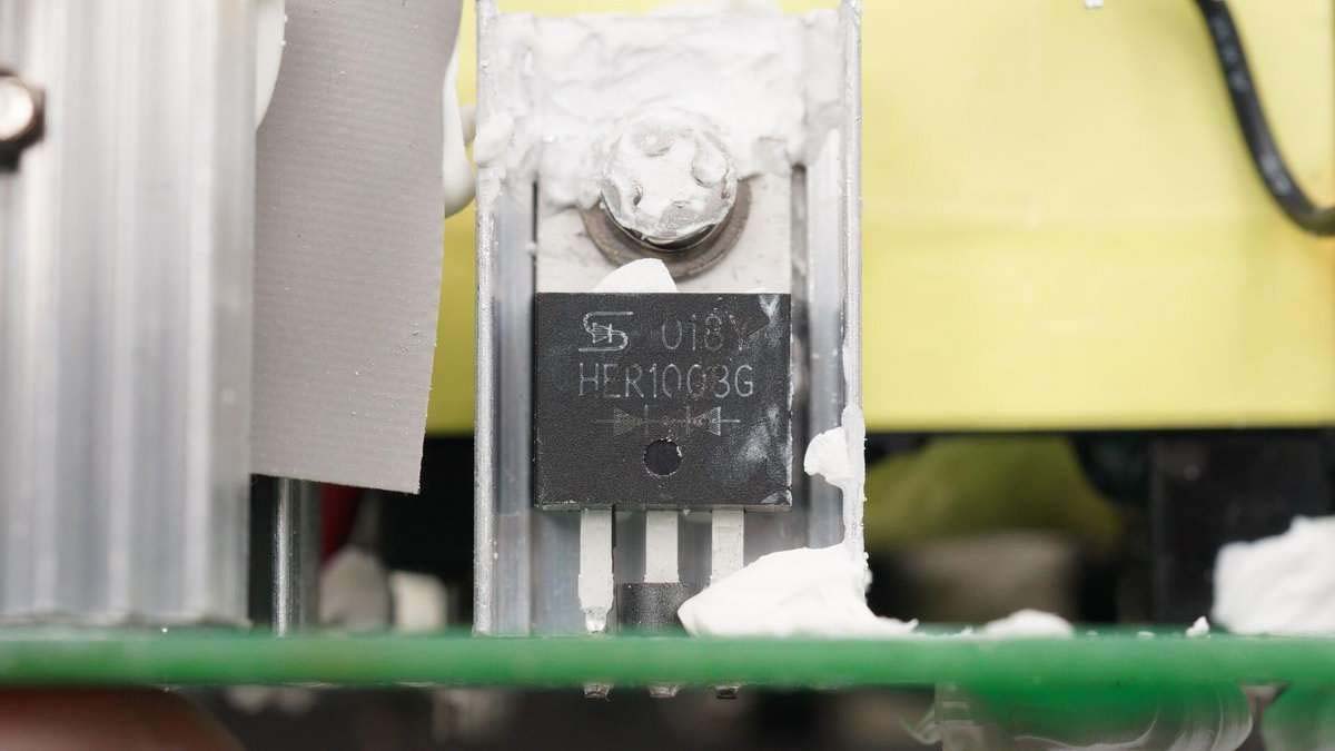 另一個散熱片上固定的也是臺半HER1008G,可想而知剩余兩個散熱片里的也是它,一共四顆,組成橋式整流。