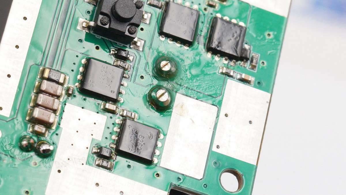保護電路板使用螺絲固定,可以看到板子上有保險絲以及多顆電池保護MOS管。