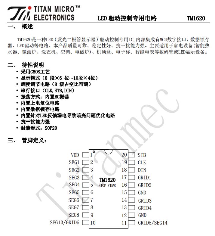 天微TM1620 LED驅(qū)動控制專用IC,用于驅(qū)動LED顯示屏。