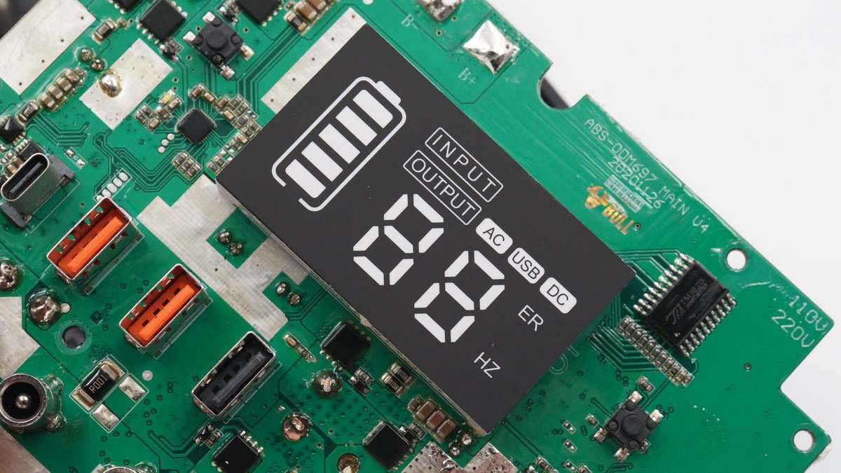 兩個開關(guān)鍵間有LED顯示屏,可顯示剩余電量以及接口使用情況。