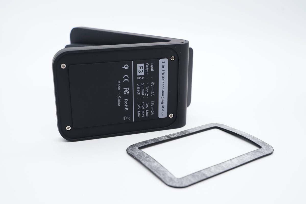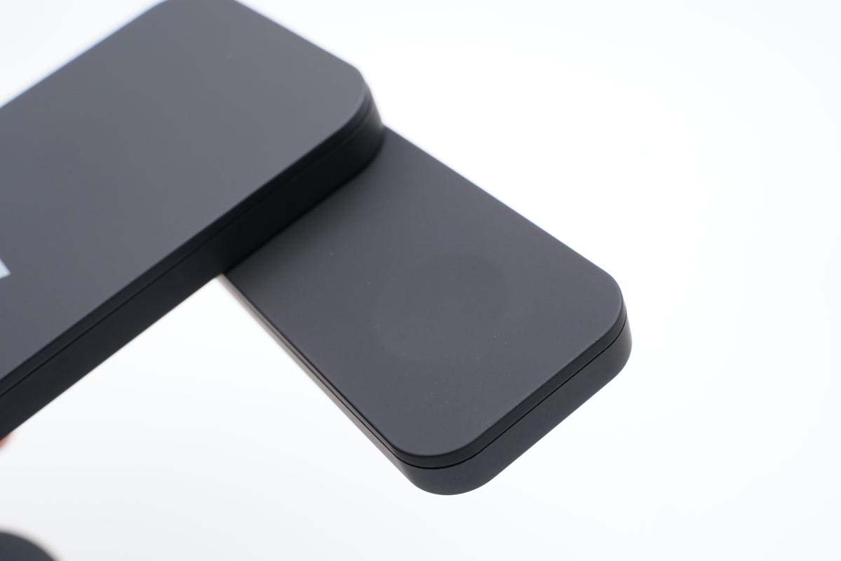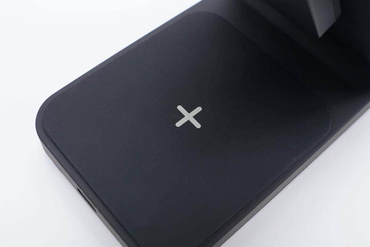 底座設有耳機無線充,貼有一塊防滑硅膠墊,中心印有“十”字表示無線充區域。