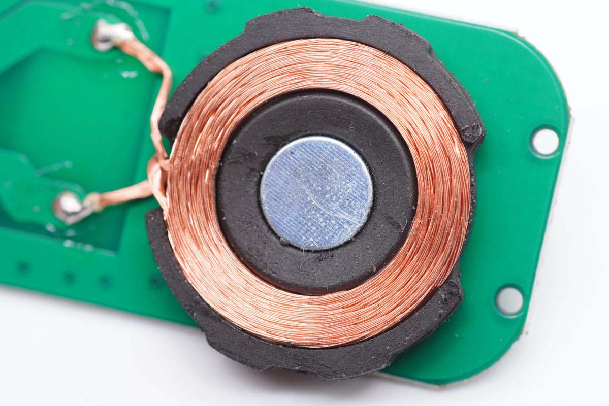 正面設有兩顆芯片,三顆NPO諧振電容并聯,無線充電線圈使用膠墊支撐固定,中心有磁鐵。