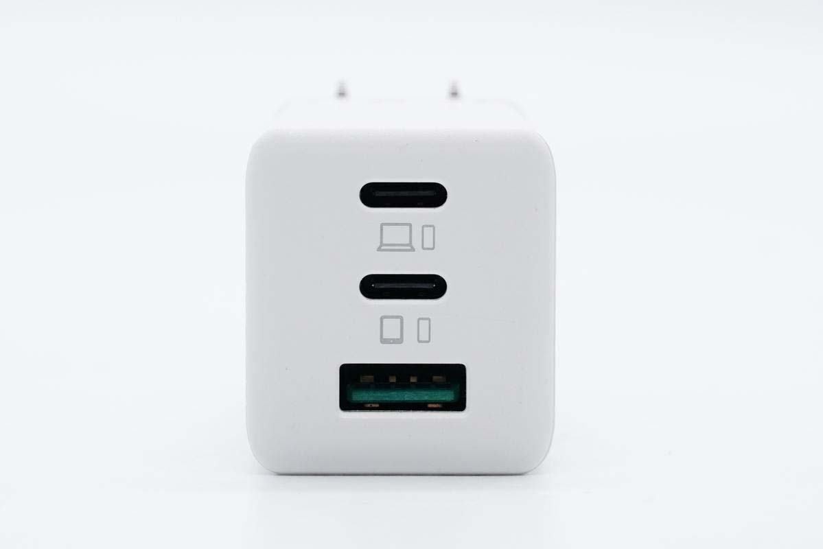 機(jī)身頂部配有2C1A接口,USB-C口黑色膠芯不露銅,USB-A口綠色膠芯,另外C口旁印有筆電、平板和手機(jī)標(biāo)識(shí)。
