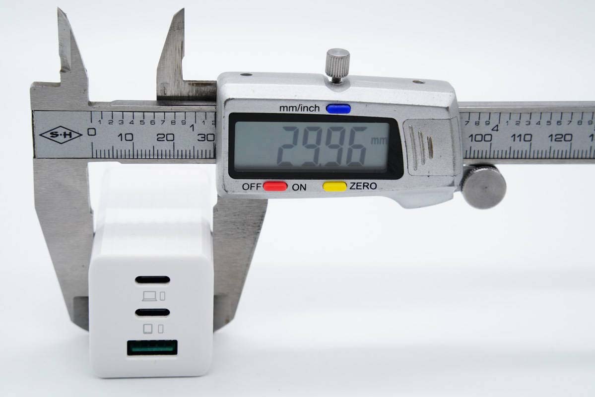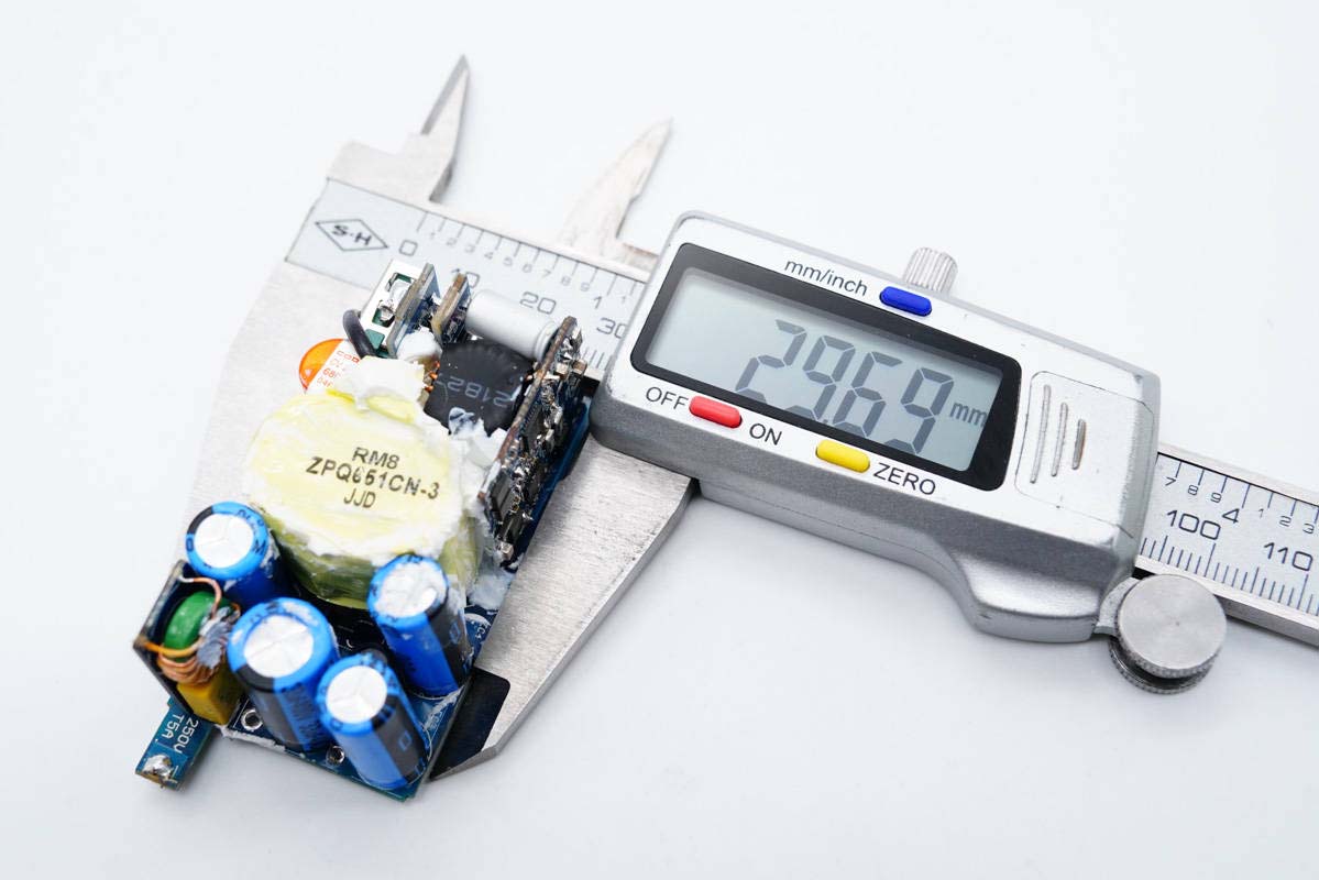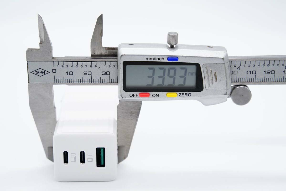 厚度為33.93mm。通過三維可計(jì)算得充電器體積為67.06cm3,那么功率密度約為0.97W/cm3,多口氮化鎵充電器中的佼佼者。