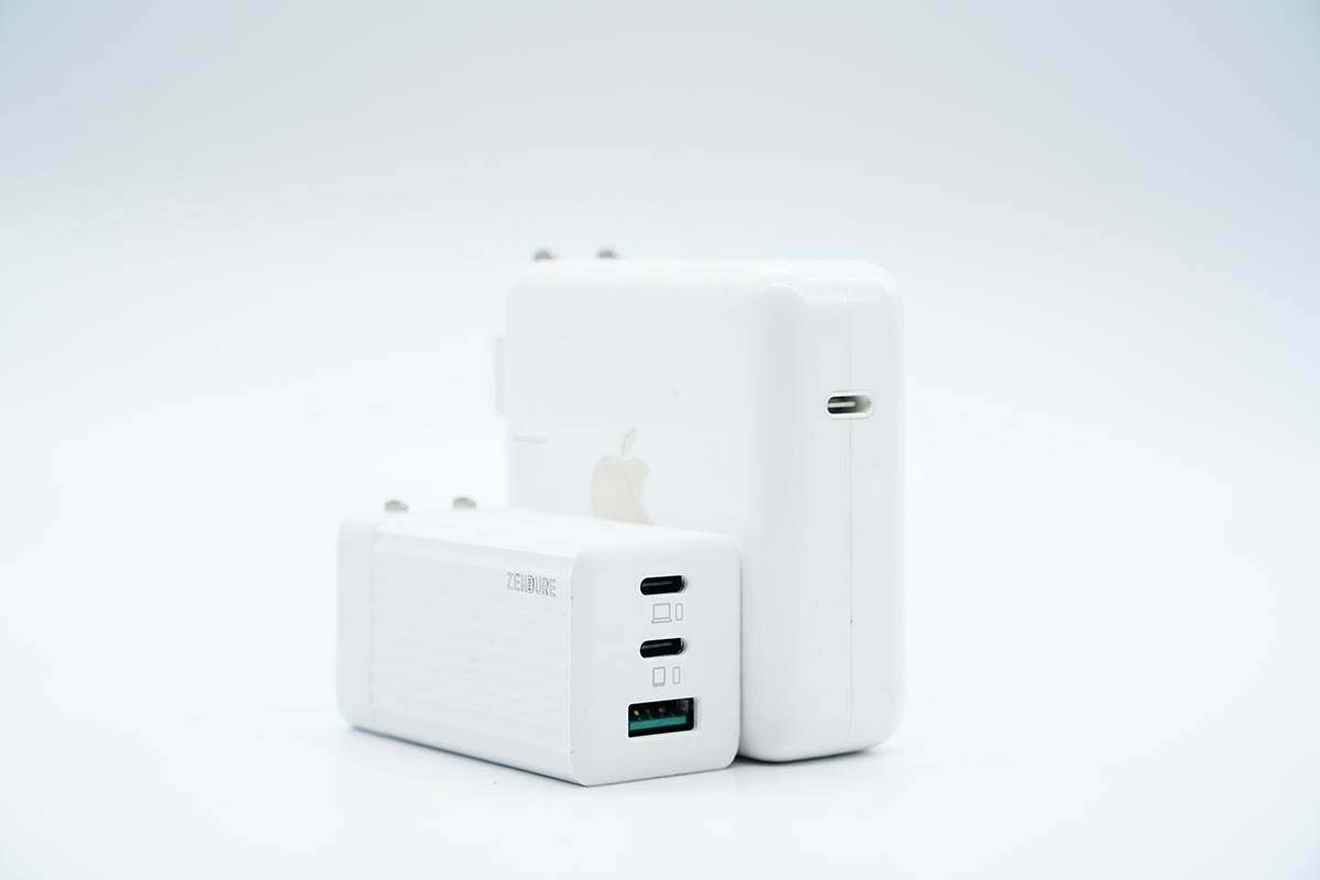 和蘋果61W充電器直觀對(duì)比,體積優(yōu)勢(shì)非常明顯。