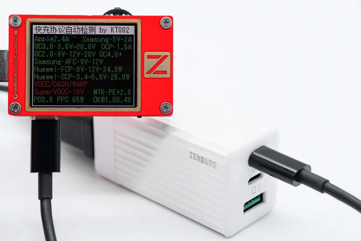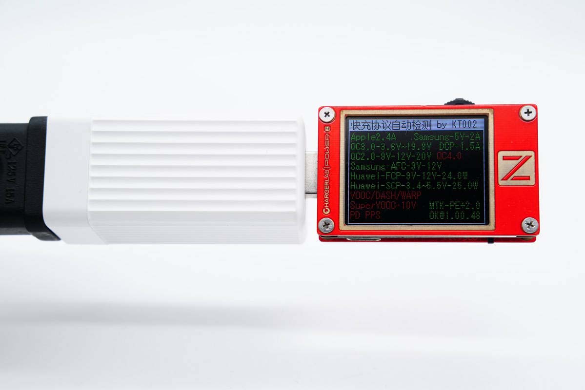 使用ChargerLAB POWER-Z KT002檢測(cè)USB-C1口的輸出協(xié)議,顯示支持Apple 2.4A、Samsung 5V2A、DCP協(xié)議,以及QC2.0/3.0、AFC、FCP、SCP、PE2.0、PD3.0、PPS快充協(xié)議,兼容性非常好。