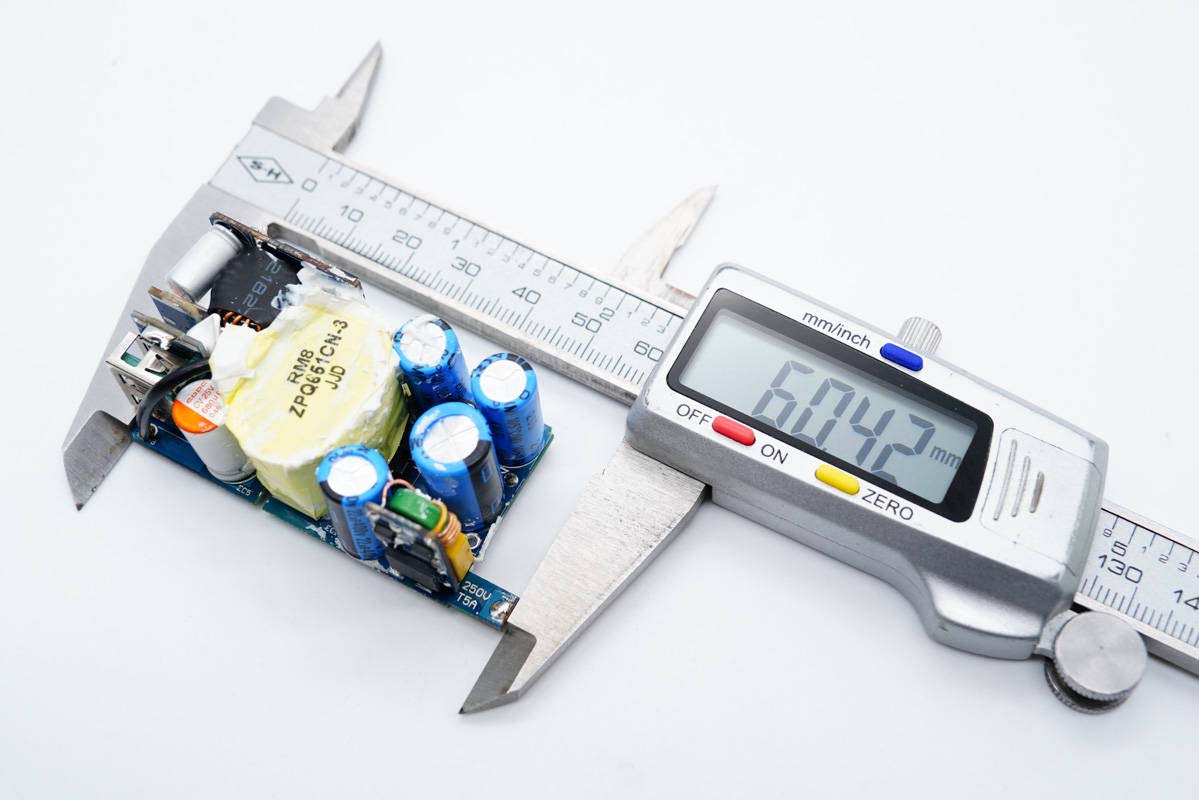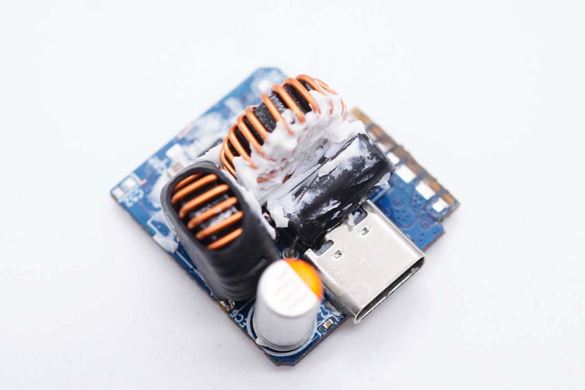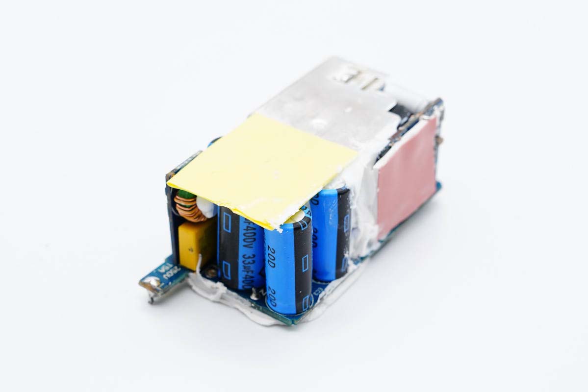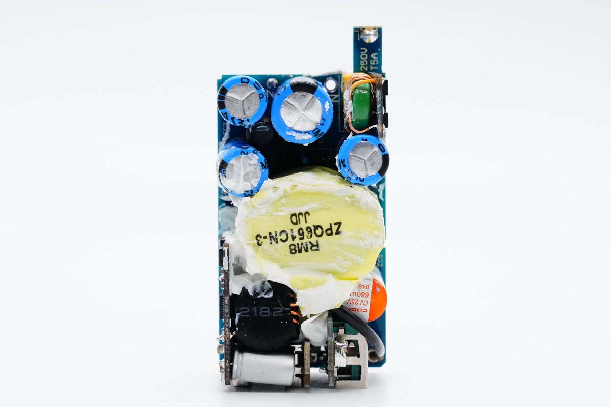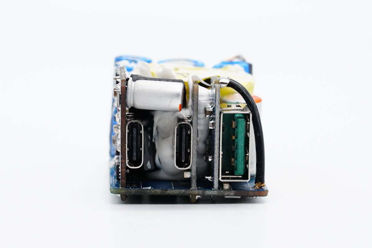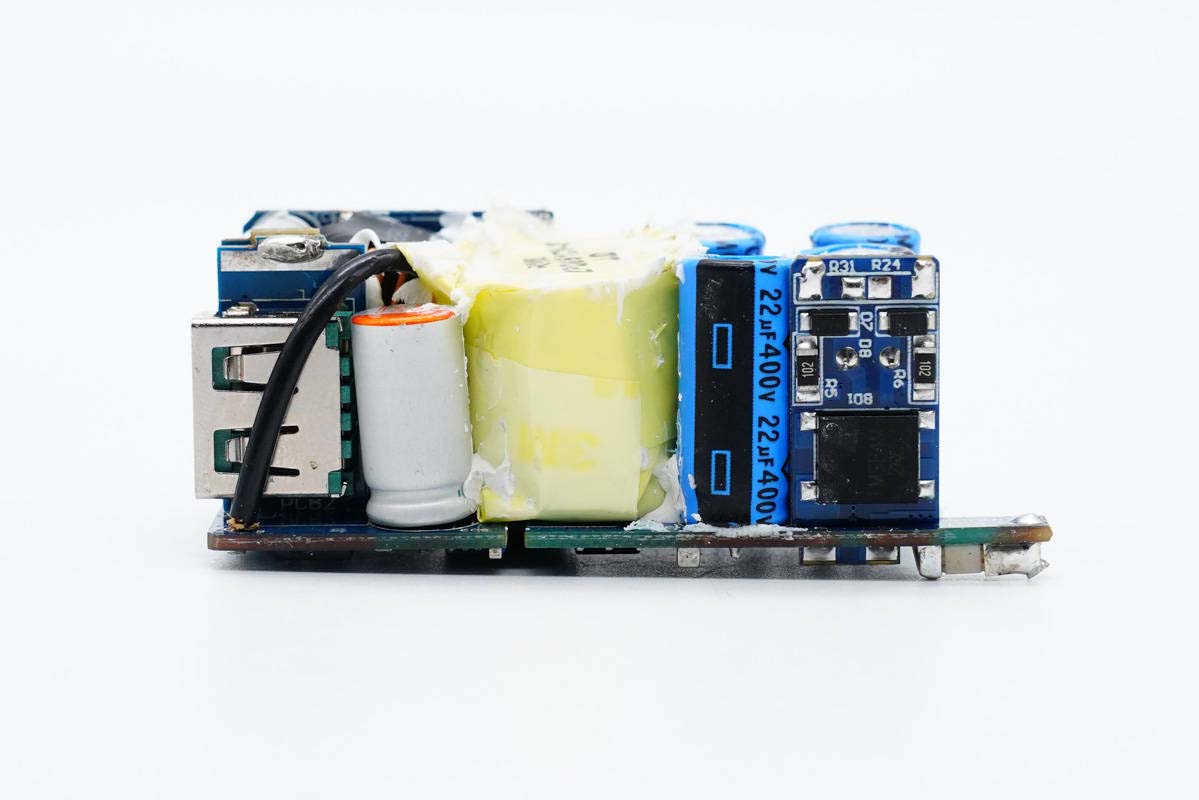 PCB板側(cè)面一覽,中間放置變壓器,左側(cè)是輸出濾波固態(tài)電容和USB-A母座。
