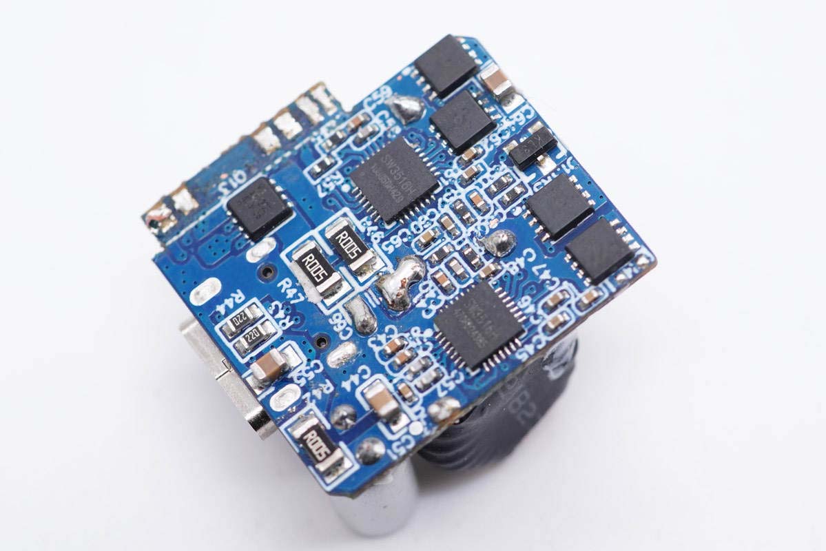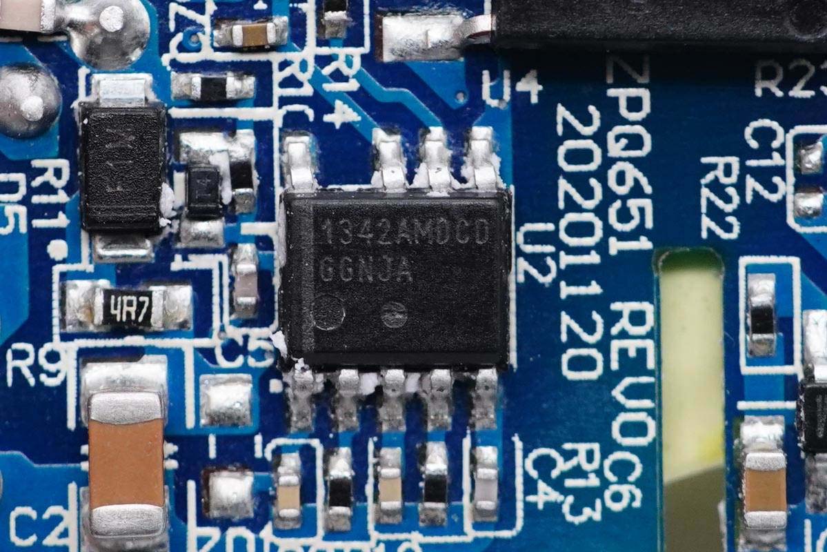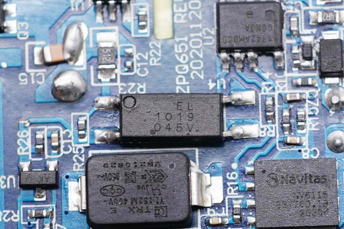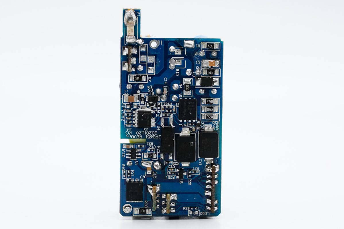 PCB板背面一覽,光耦以及兩顆貼片Y電容橫跨初次級(jí),初級(jí)側(cè)設(shè)有貼片保險(xiǎn)絲、主控芯片和氮化鎵功率開關(guān)管,次級(jí)側(cè)設(shè)有同步整流控制器和整流管。