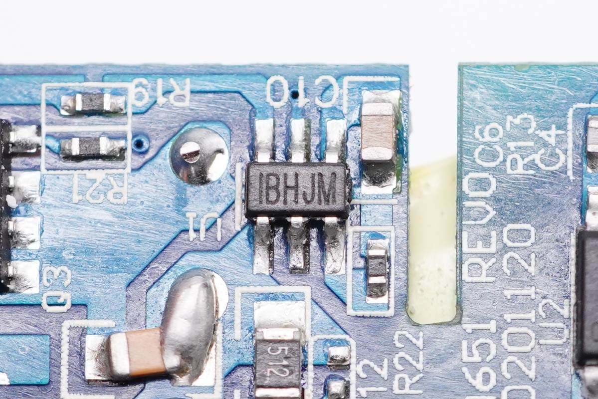 絲印IBHJM次級(jí)同步整流控制器,實(shí)際型號(hào)為MP6908A,來自MPS芯源半導(dǎo)體,最高工作頻率600KHz,支持DCM,CCM和QR以及ACF工作模式,支持標(biāo)準(zhǔn)電壓和邏輯電壓驅(qū)動(dòng)的同步整流管。