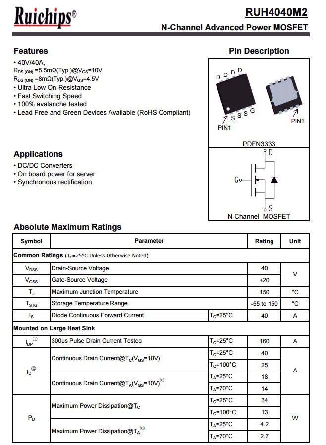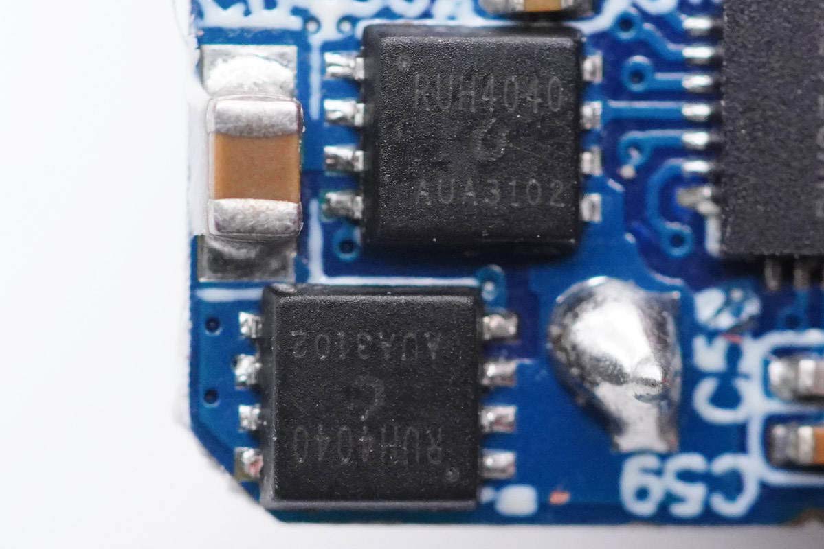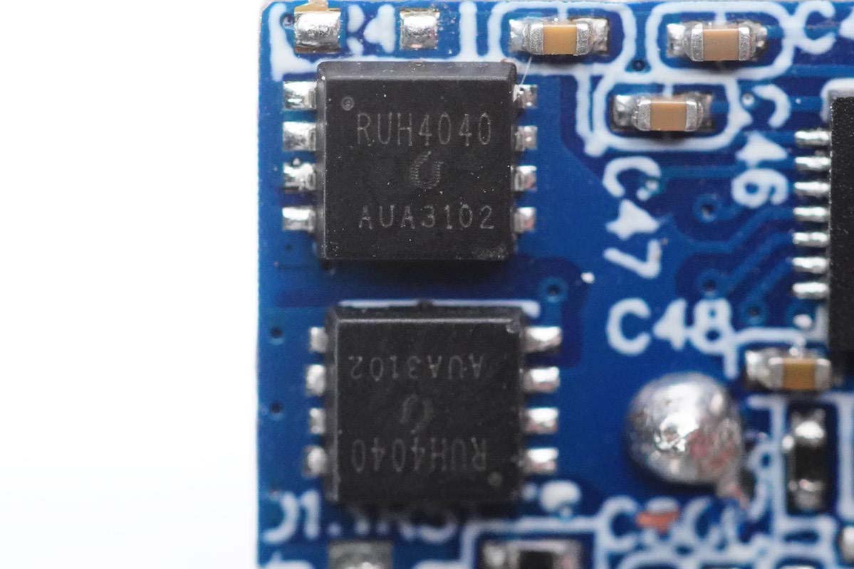 兩顆SW3516H均外掛兩顆MOS管,用于為USB口輸出同步整流降壓。MOS管為銳駿半導(dǎo)體的RUH4040M2,耐壓40V。