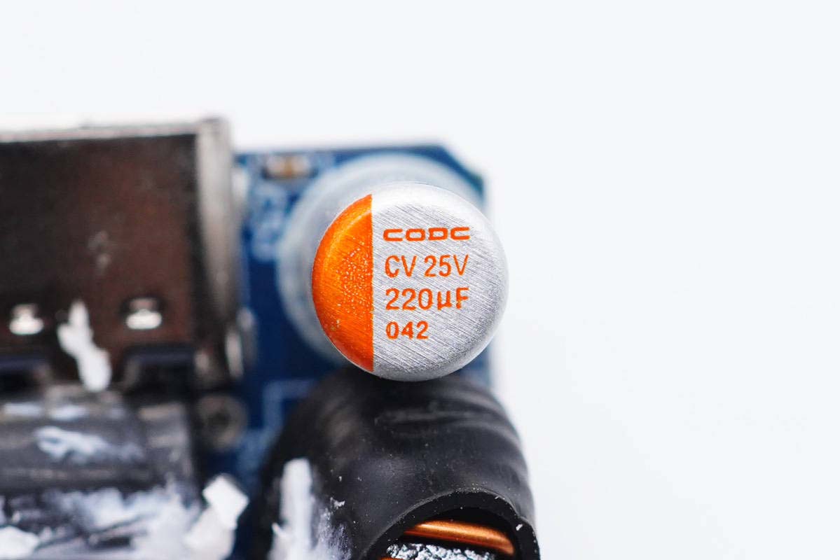 固態(tài)電容外套絕緣管保護(hù),規(guī)格25V 220μF。
