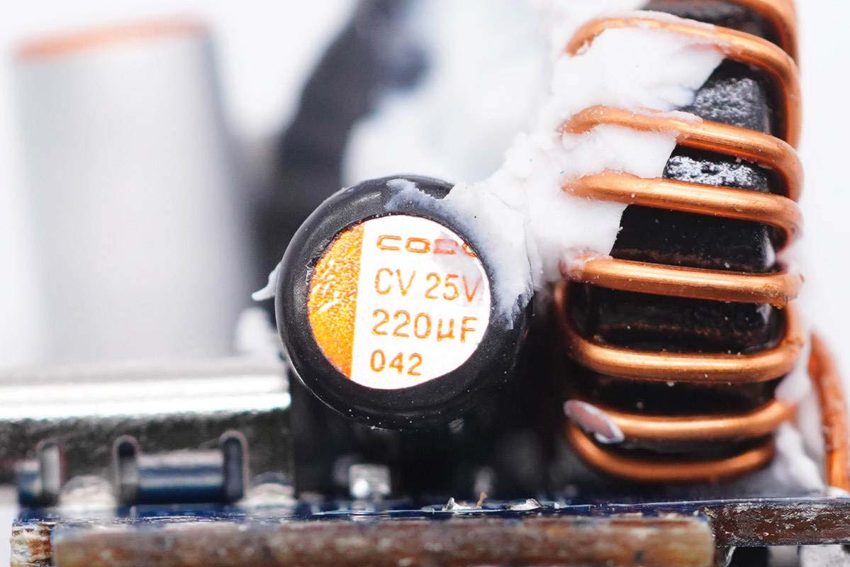 降壓輸出濾波固態(tài)電容也是來自華容偉業(yè),規(guī)格為25V 220μF。