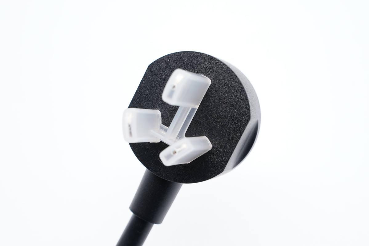 插頭兩側設有凹槽,方便用戶插拔使用,插腳套有膠套保護。