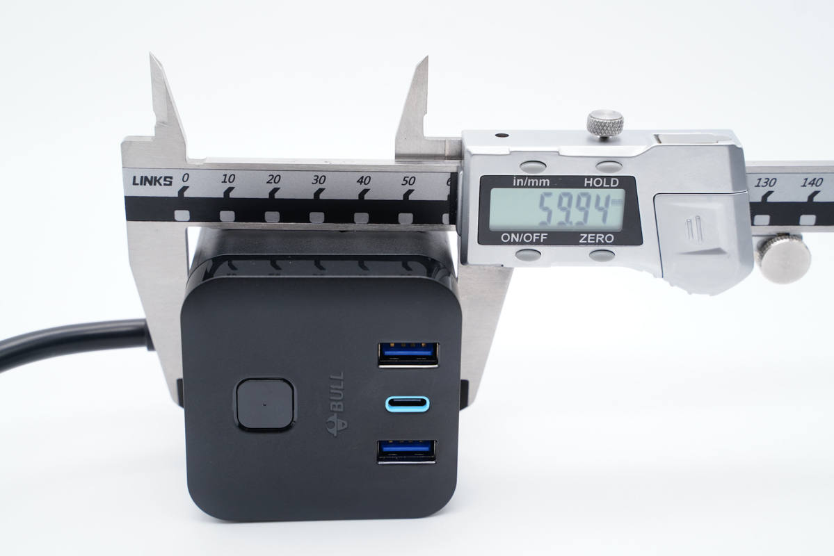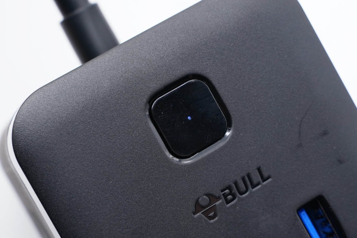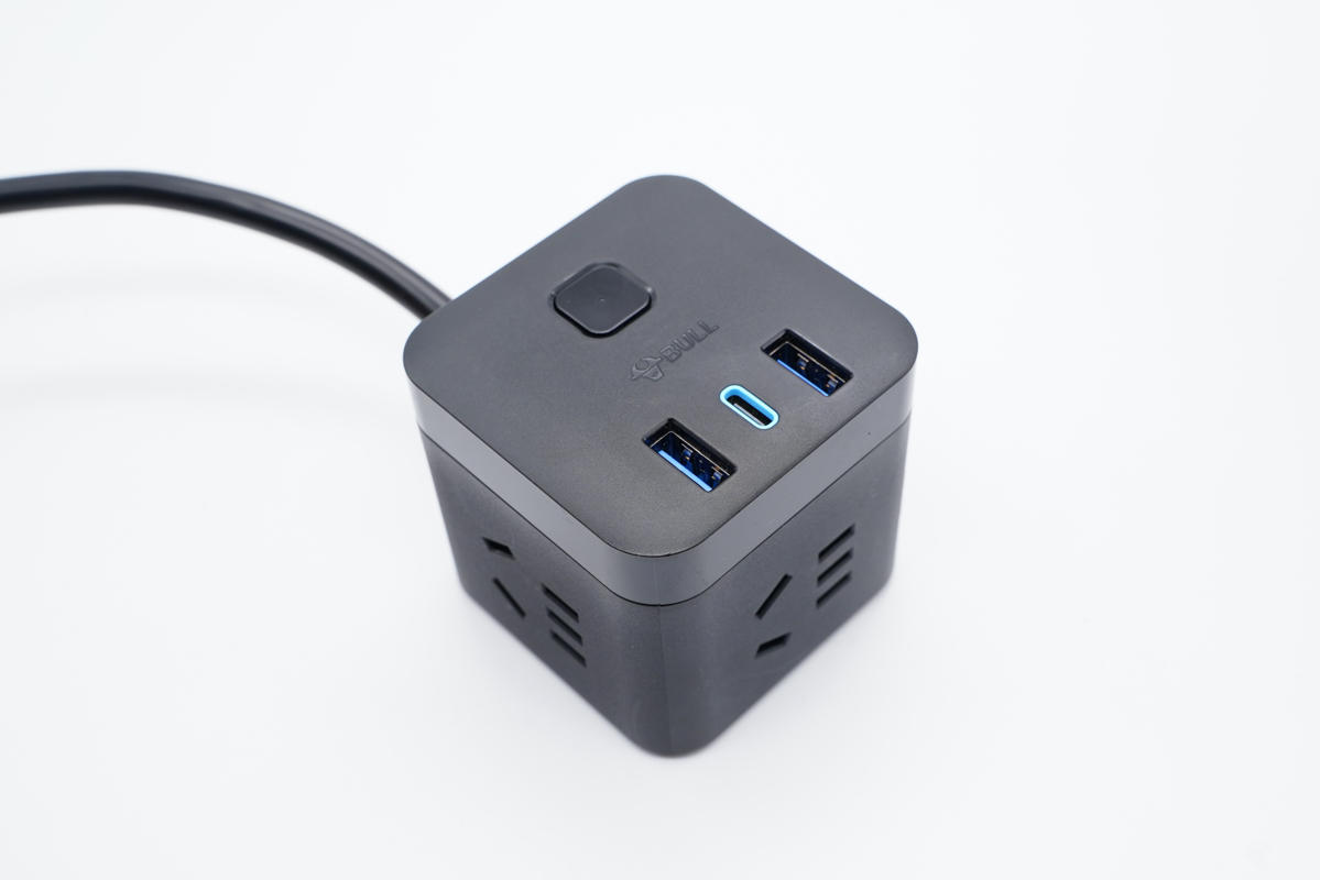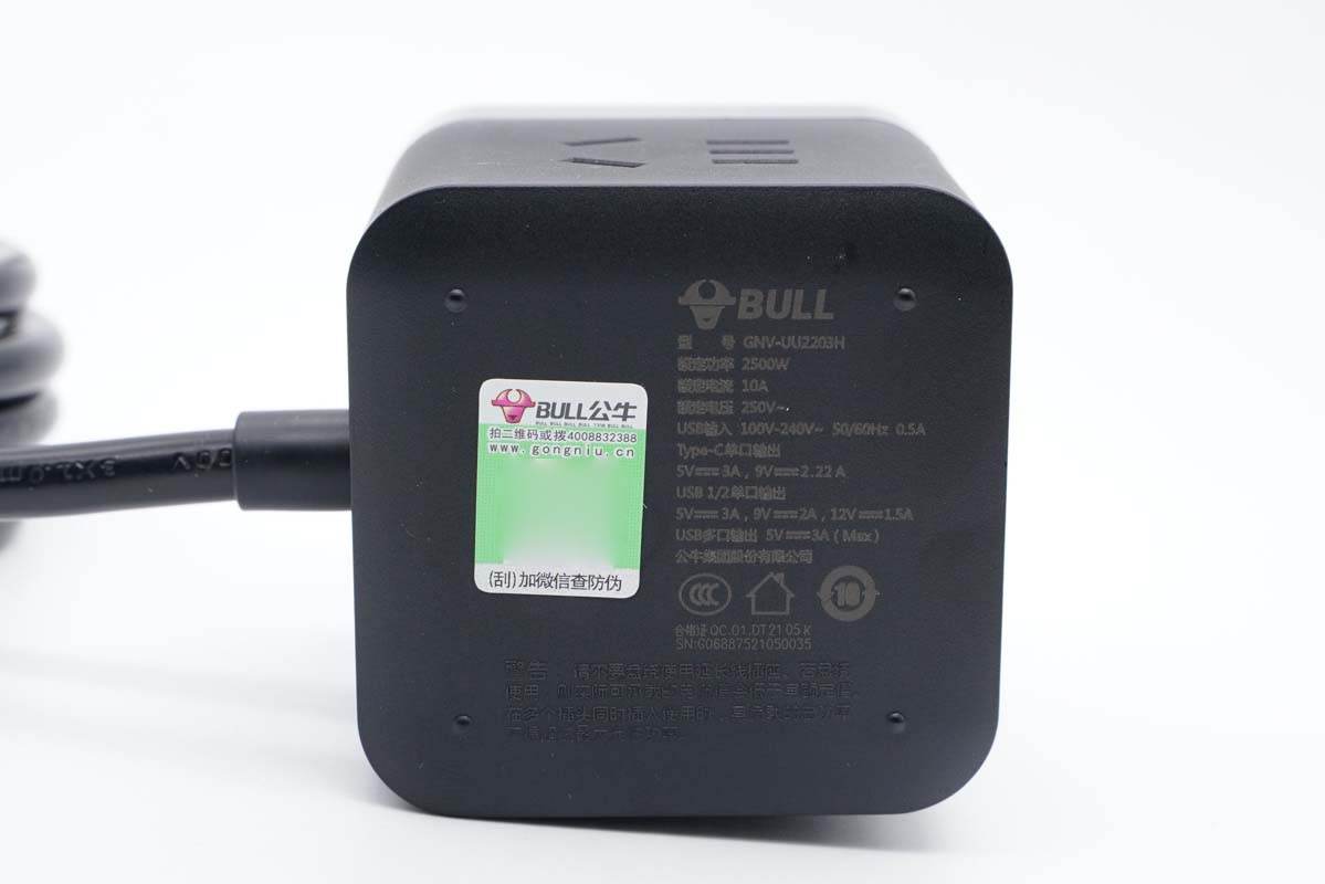 頂部配有電源鍵以及2A1C三個USB接口,中心凹印BULL品牌logo。兩個A口采用藍色膠芯,C口采用黑色膠芯,不過配有一個藍色塑料環裝飾。