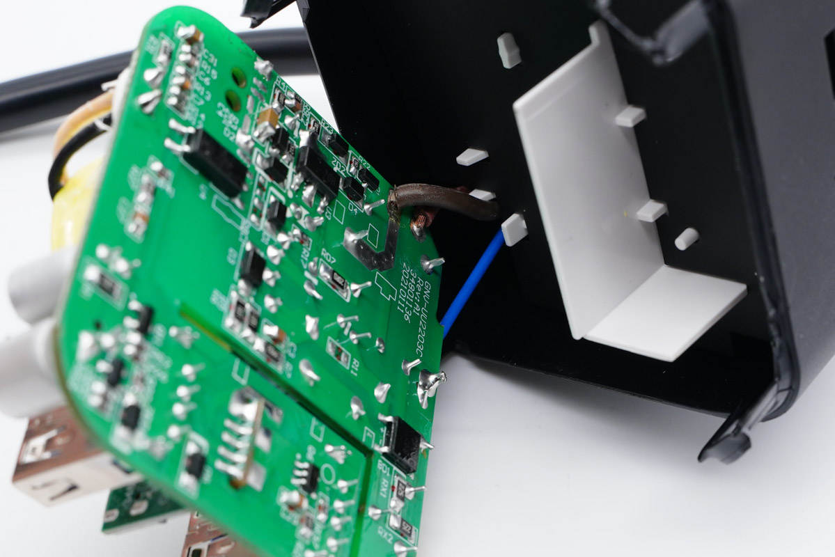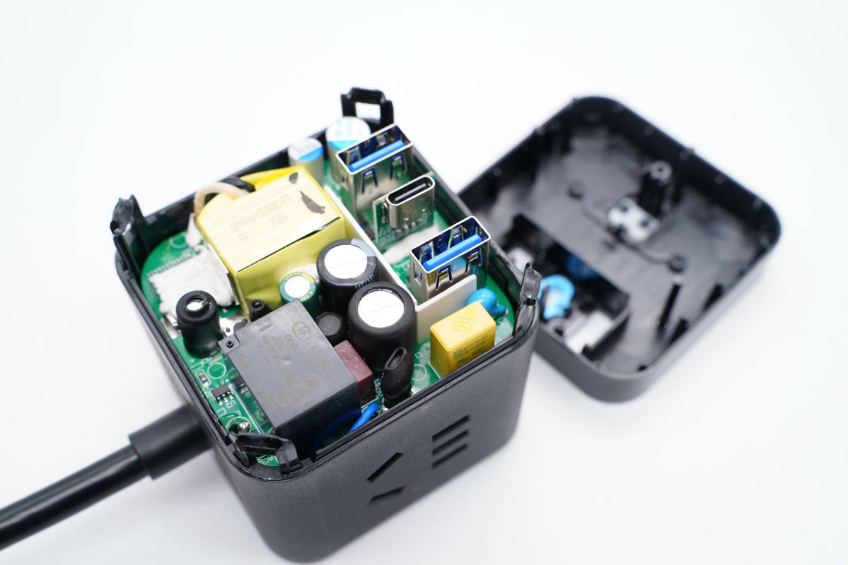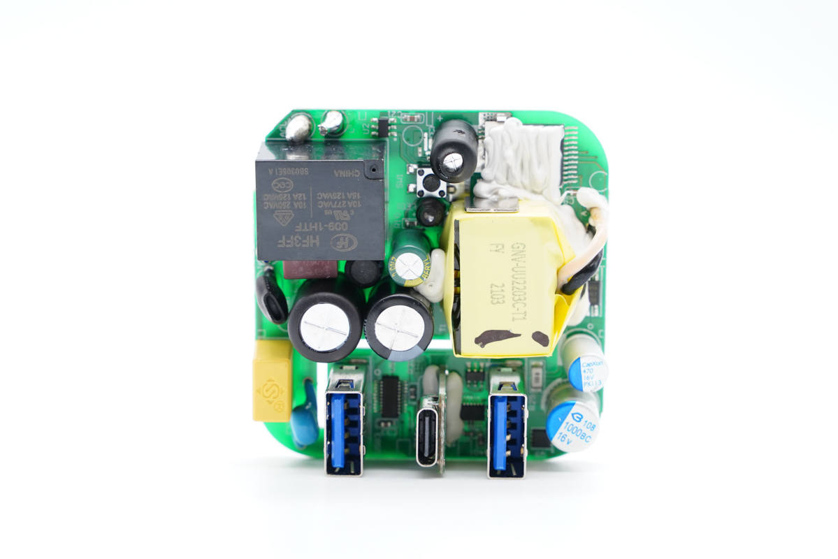 輸出端兩個USB-A母座加長設計,USB-C母座焊接在小板上,并打膠加固。