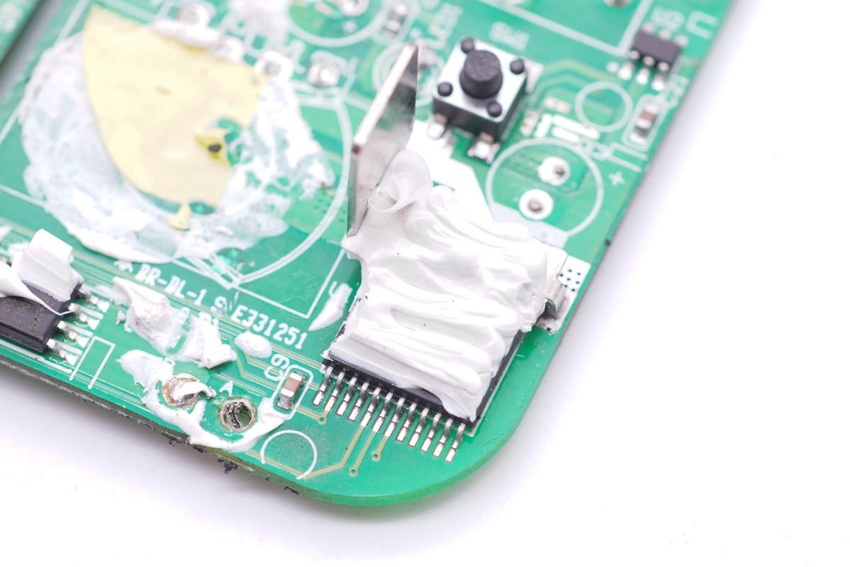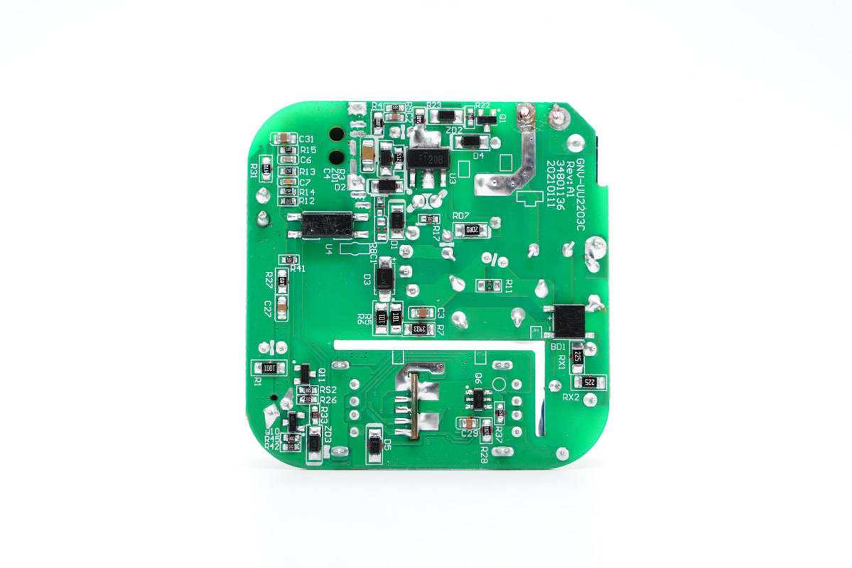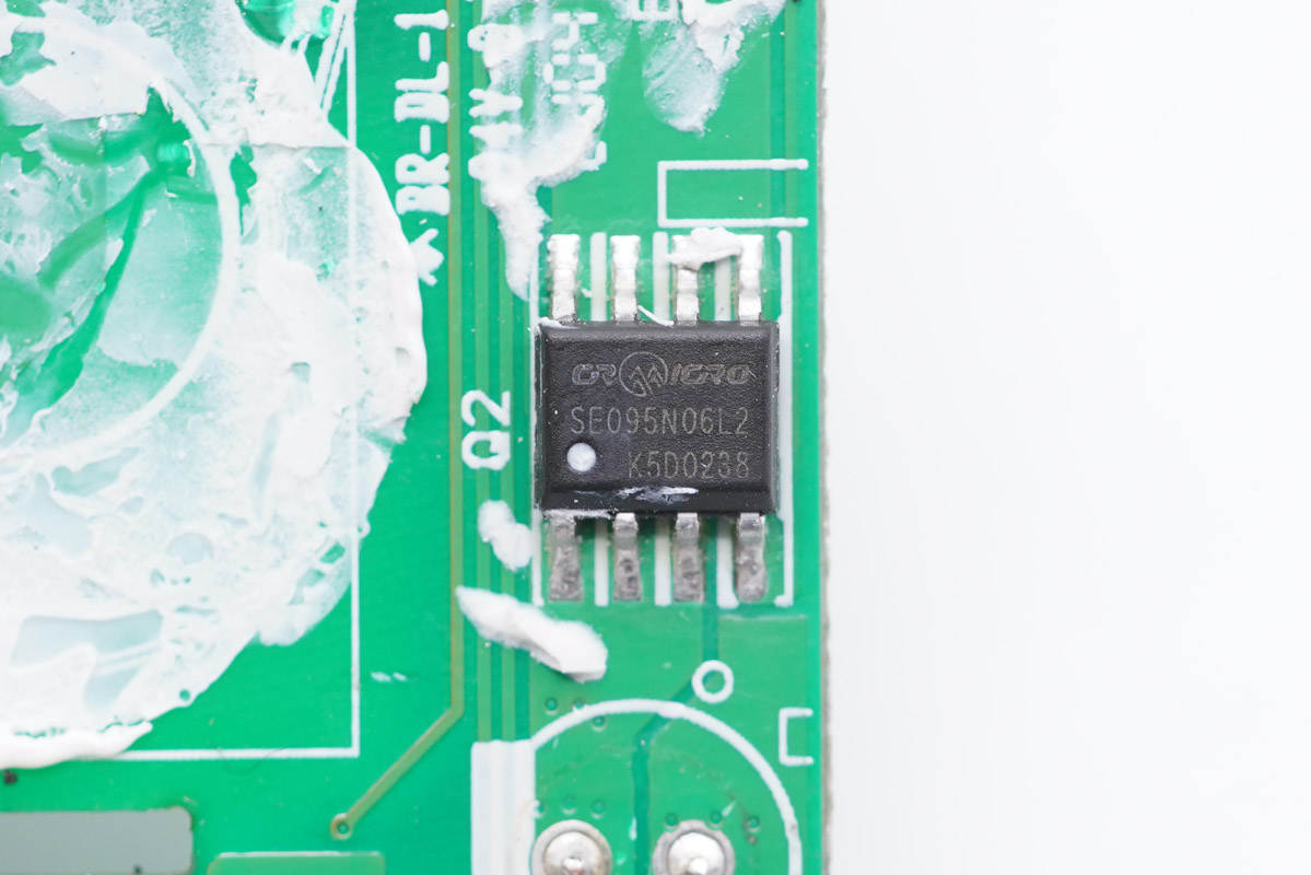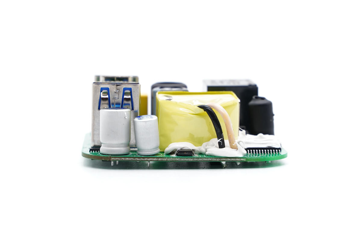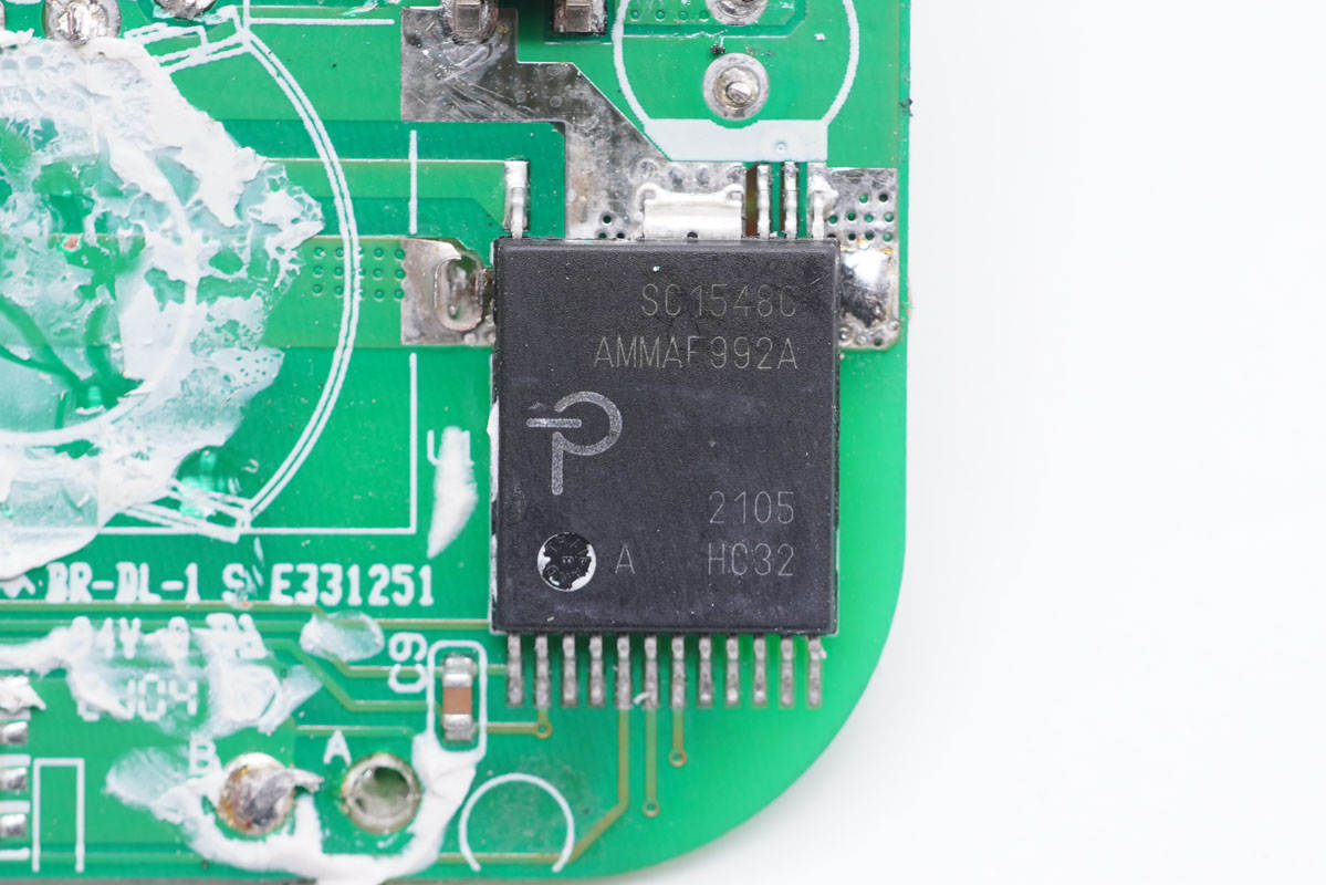 來自PI的主控芯片SC1548C,內置反激式控制器、初級開關管,以及次級側檢測和同步整流控制器,此外還帶有HIPOT隔離保護的集成反饋鏈路,集成度非常高。使用時無需搭配光耦,內建多重保護功能,芯片正面涂有導熱膠幫助散熱。