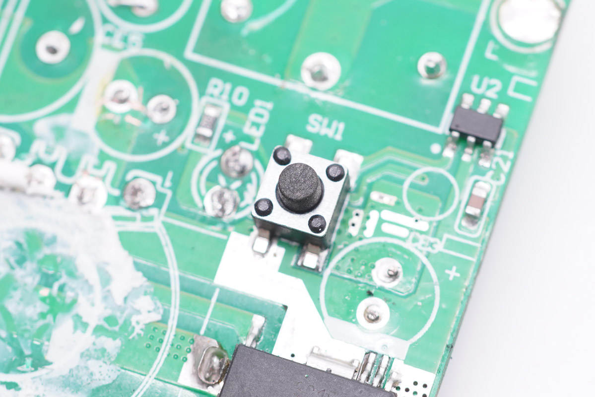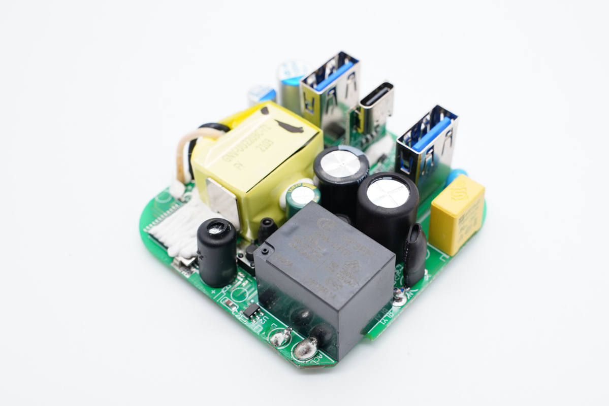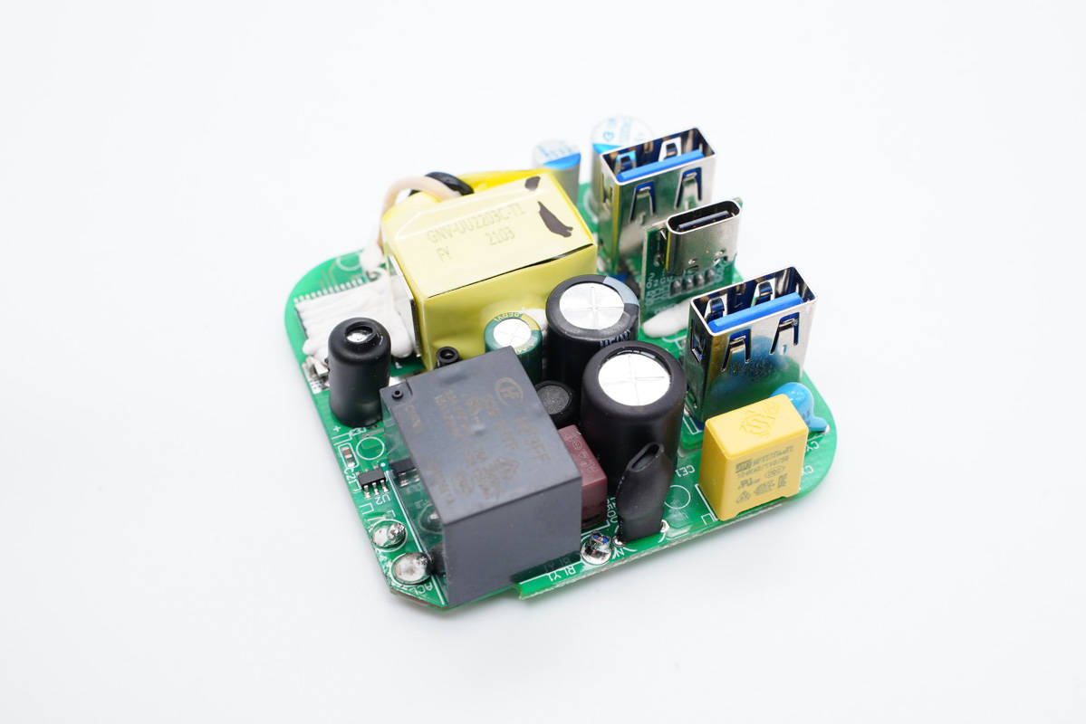 PCB板正面一覽,除了充電器的元器件外,左上角還有繼電器,用于整個插線板的輸出控制,變壓器打膠加固。