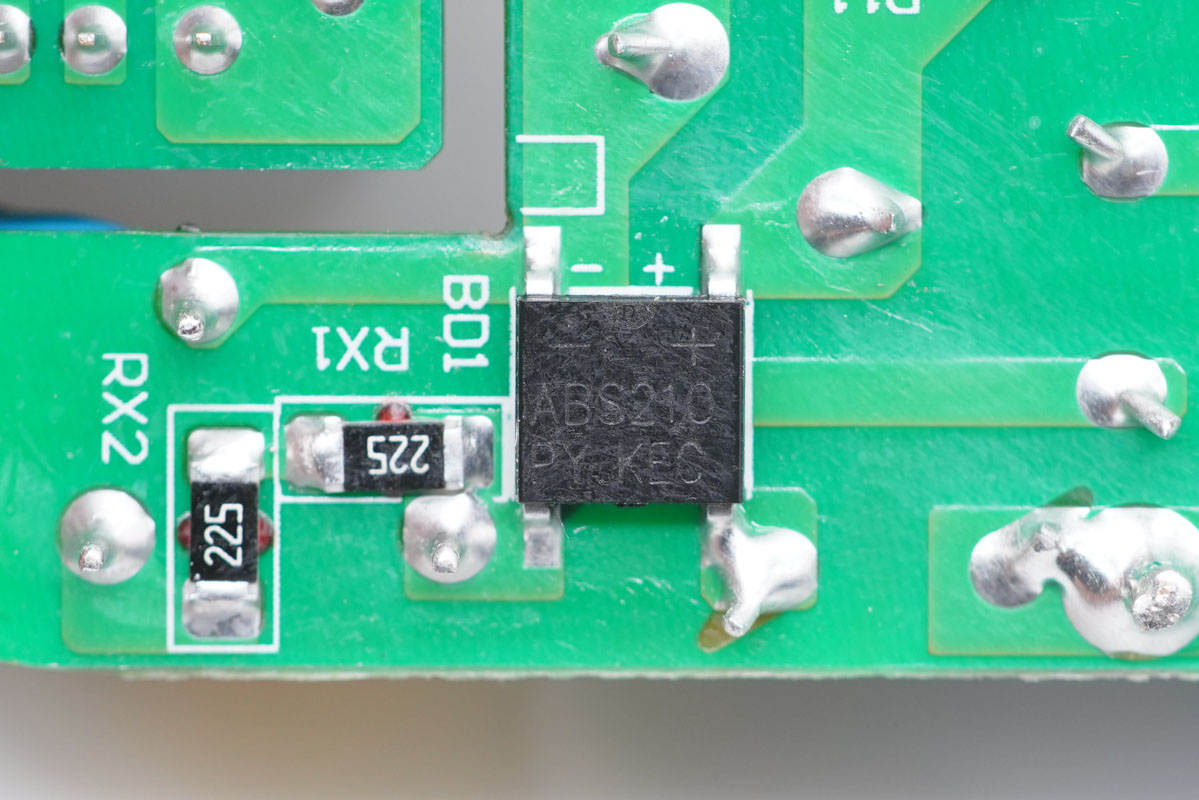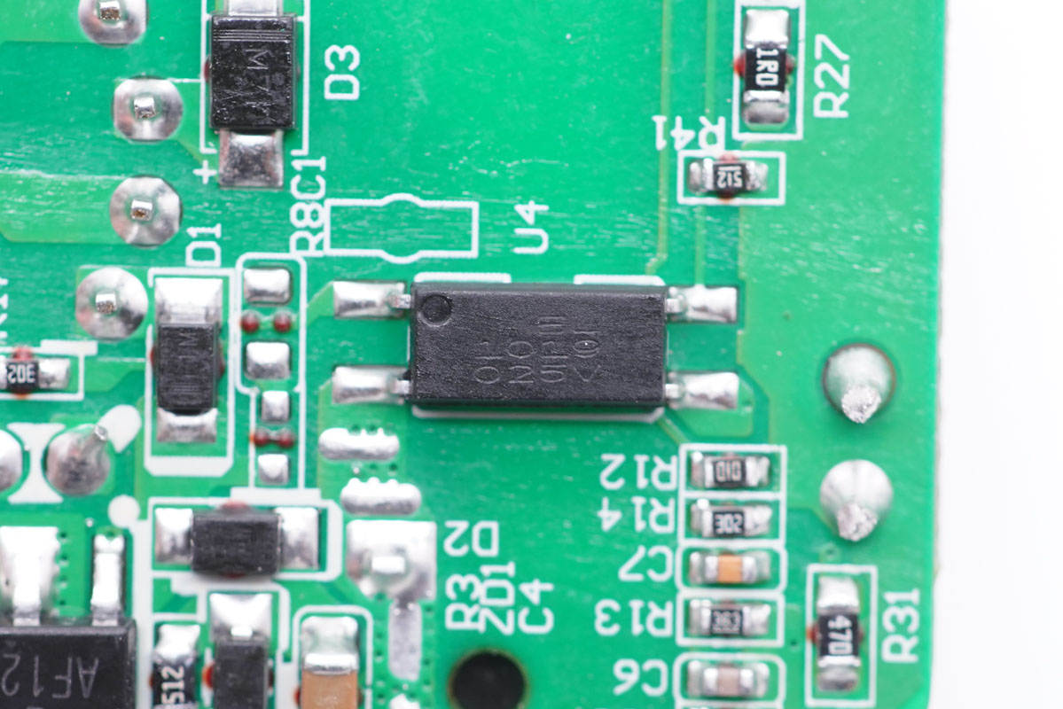 PCB板背面一覽,初次級之間設有鏤空槽放置絕緣板,可以看到背面有整流橋、光耦等。