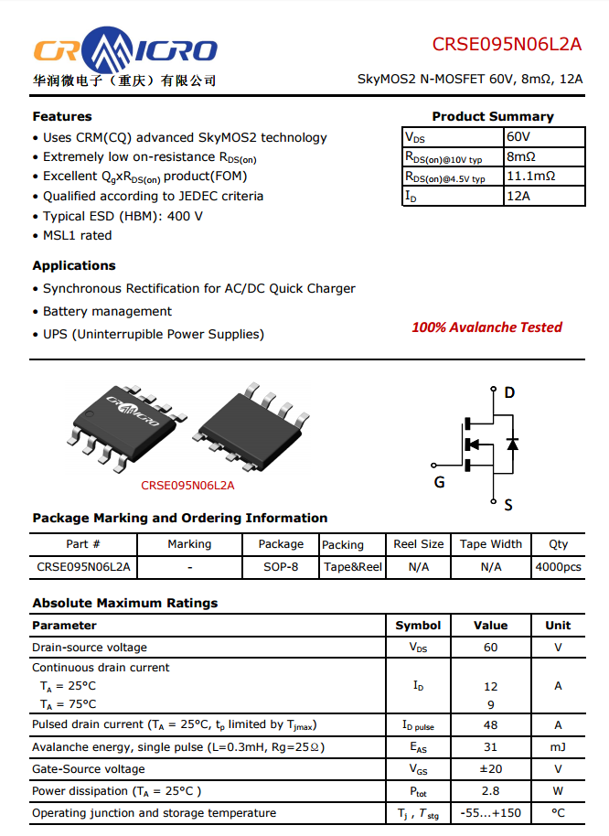 同步整流MOS管采用華潤微CRSE095N06L2A,NMOS,耐壓60V,SOP-8封裝。