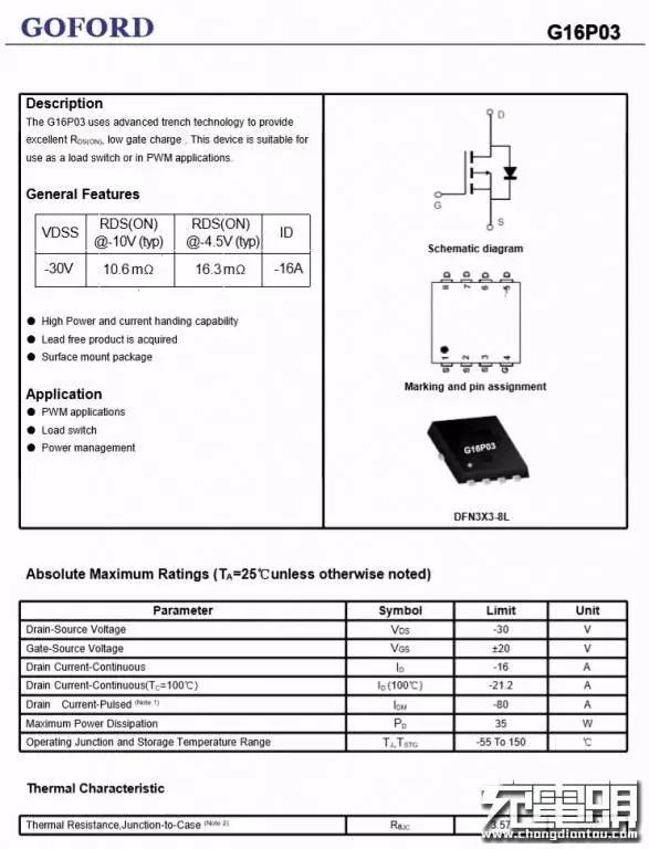 谷峰G16P03,PMOS管,耐壓30V,用于兩個A口輸出分配。
