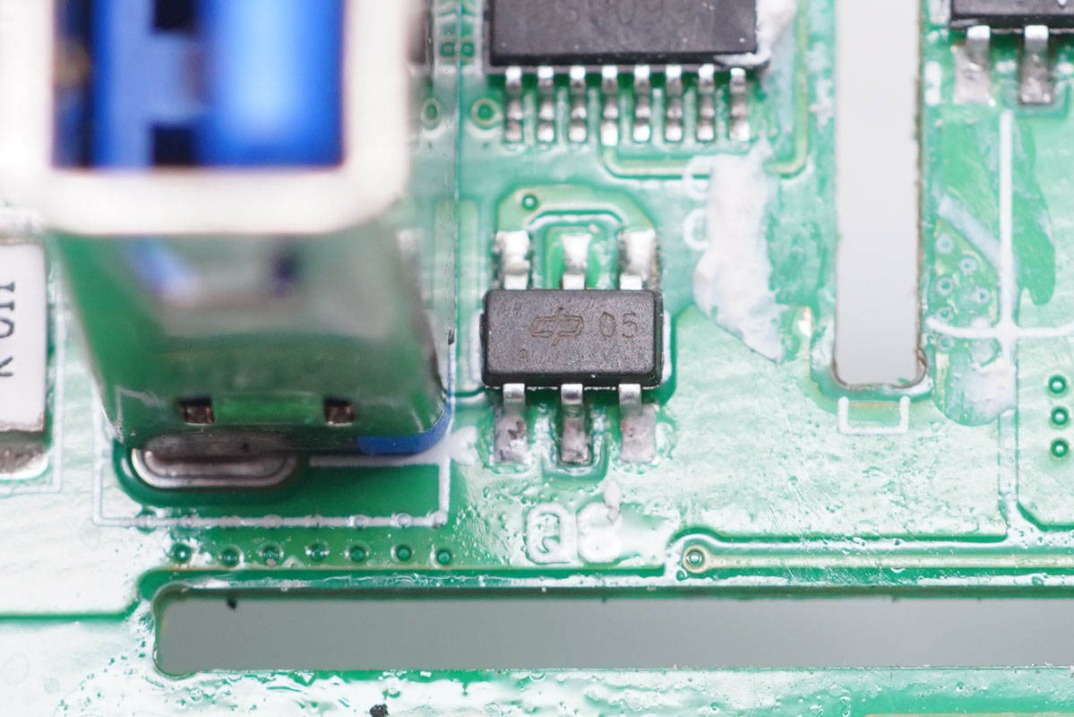 USB-A母座輸出VBUS開關管特寫,德普微DP8205,NMOS管,耐壓20V,SOT23-6封裝。