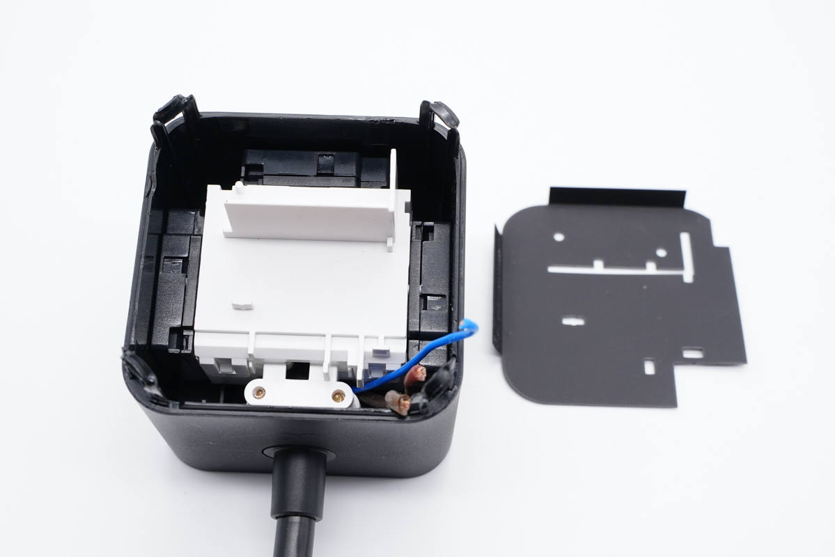 最后將黑色絕緣板隔離取出,機身槽中心塞有白色塑料外殼來固定安全門板。