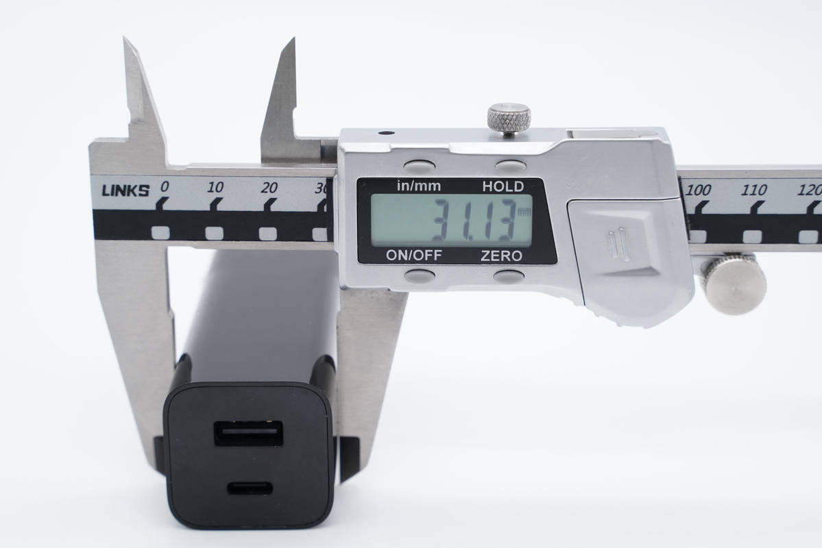 和蘋果61W充電器對比,體積優(yōu)勢非常明顯。