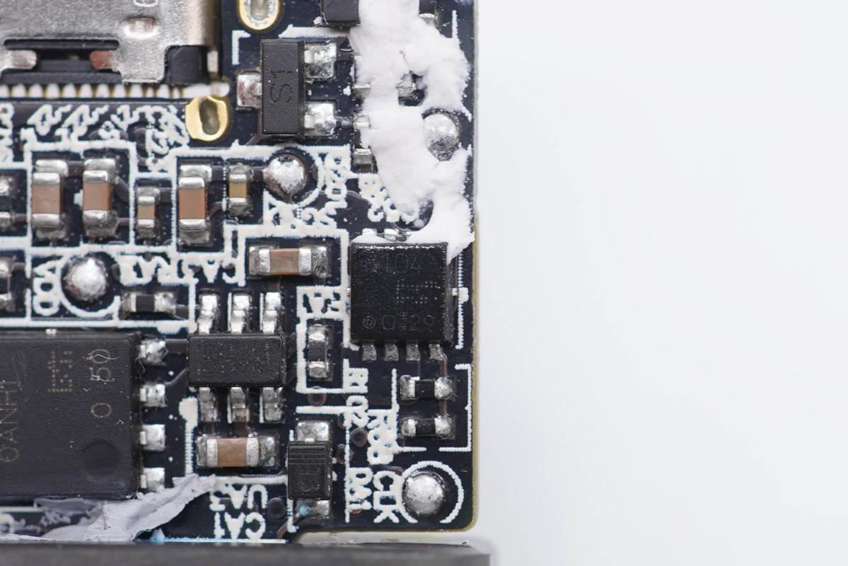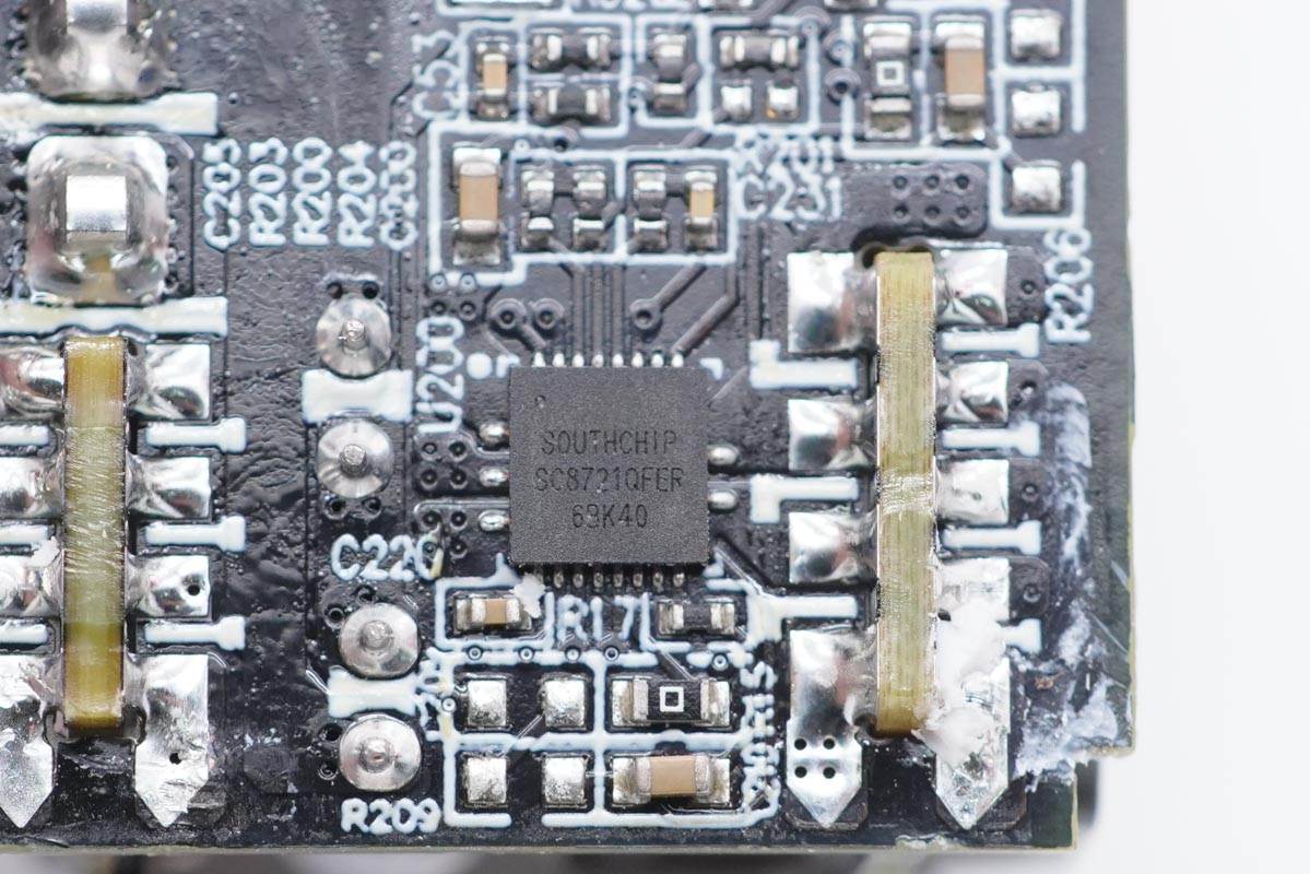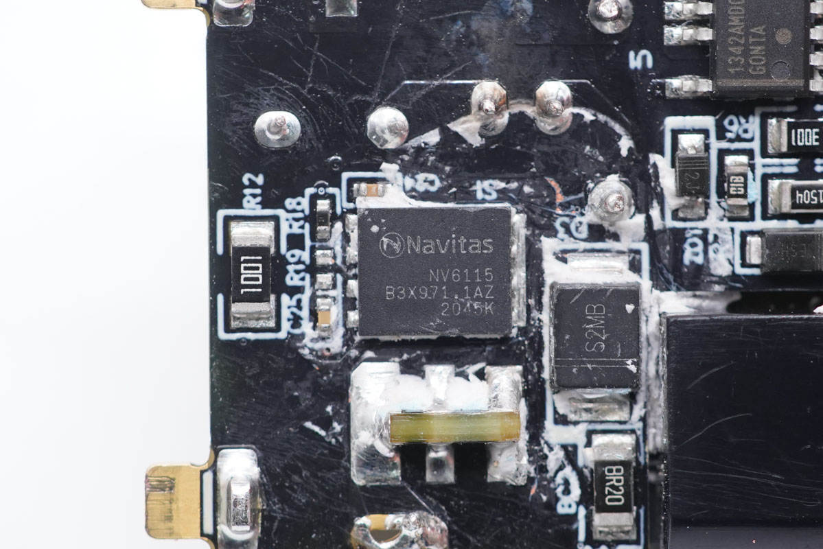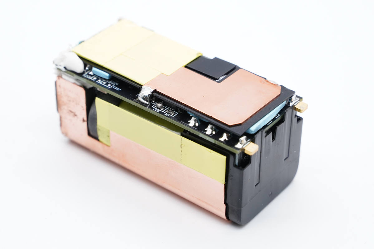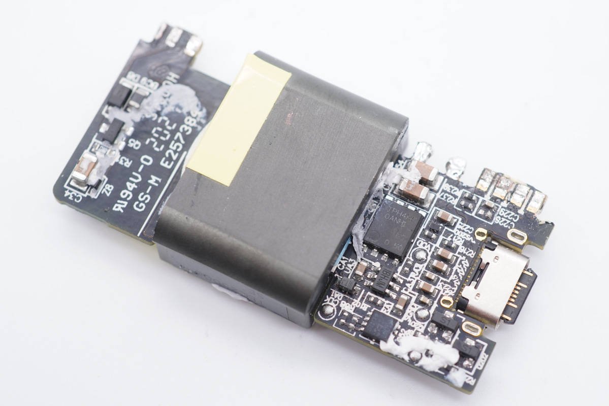 主板背面一覽,平面變壓器對應(yīng)區(qū)域鏤空,以降低厚度。主板背面從上而下可以看到氮化鎵功率芯片、主控芯片、光耦和貼片Y電容,以及用于A口輸出的同步升降壓轉(zhuǎn)換器等器件。