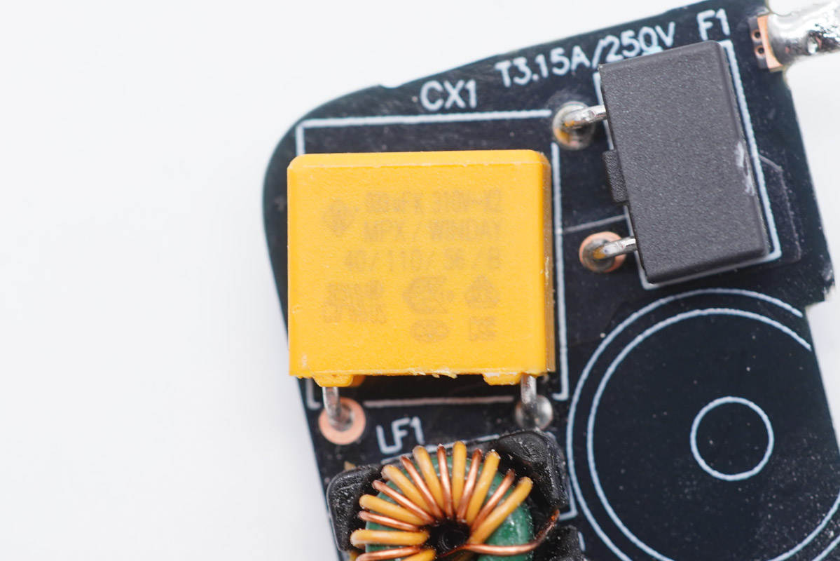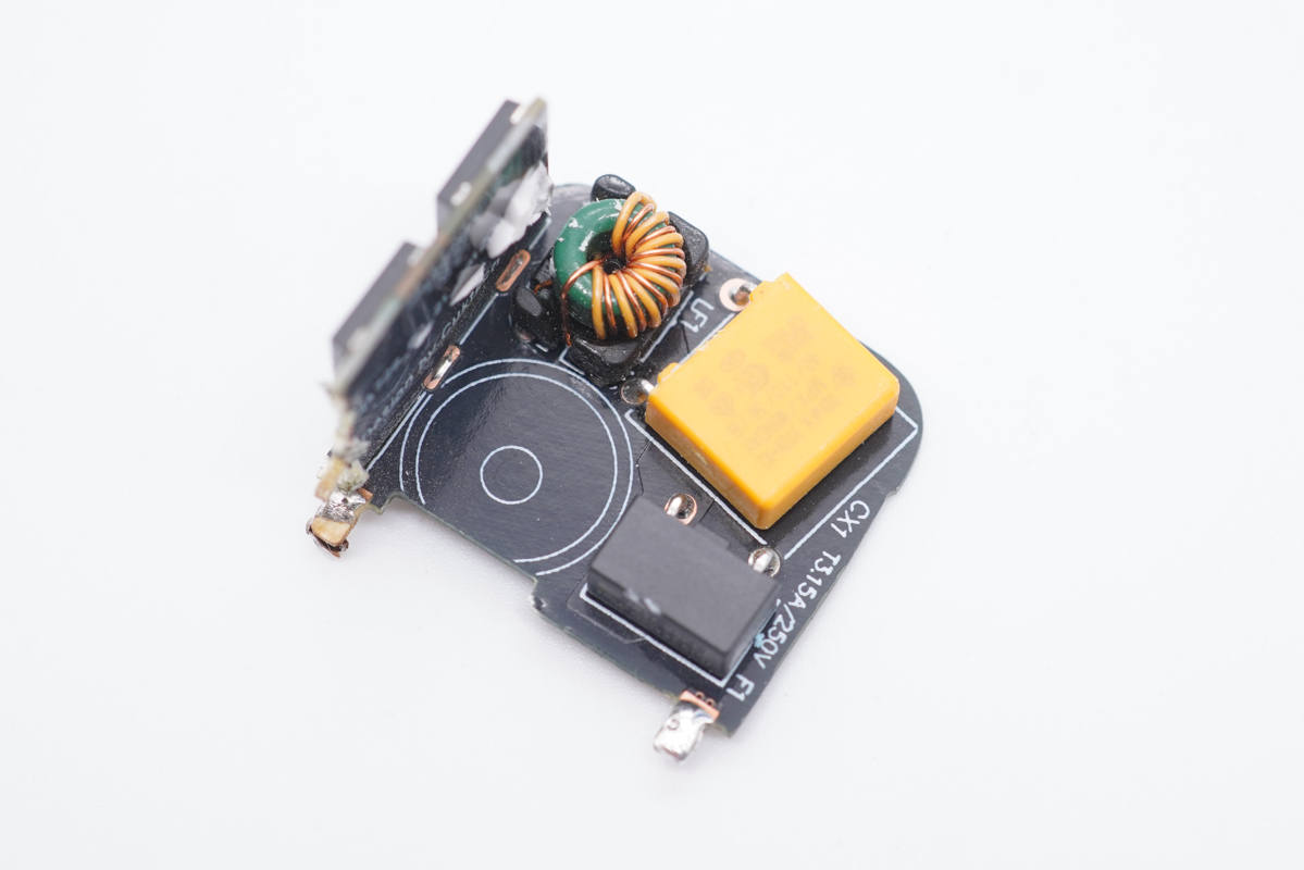 通過觀察發(fā)現(xiàn),紫米65W 1A1C氮化鎵快充充電器采用高頻QR開關(guān)電源寬范圍輸出,USB-A口同步整流升降壓,兩個接口使用一顆協(xié)議芯片控制輸出電壓的設(shè)計架構(gòu)。下面我們從輸入端開始一一了解各器件的信息。