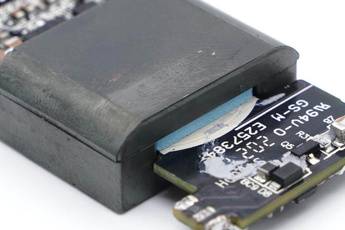 磁芯與變壓器電路板之間塞有一塊藍色導(dǎo)熱墊,將線圈發(fā)熱傳導(dǎo)至磁芯加強散熱。