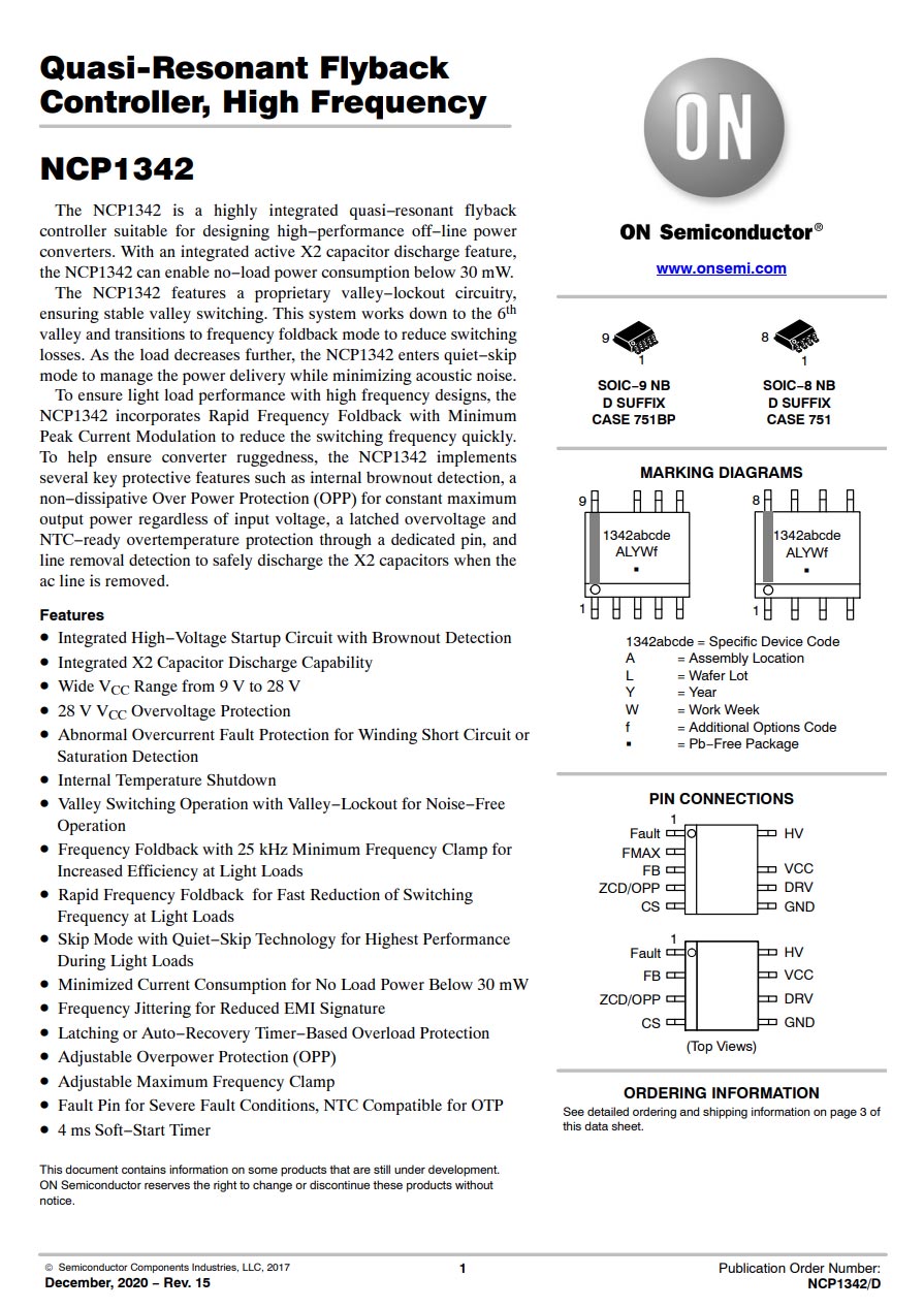 開關(guān)電源主控芯片采用ON安森美NCP1342,這是一顆高頻準(zhǔn)諧振反激初級PWM控制器,內(nèi)置主動X2電容放電和多重完善的保護功能,具有超低的待機功耗。